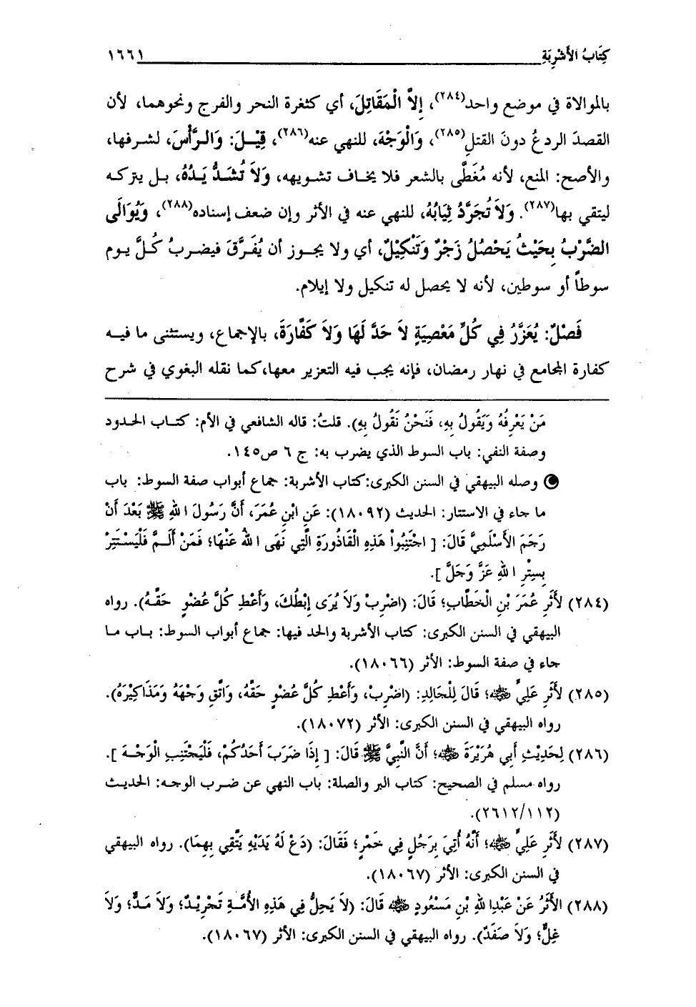 (¬284) لأَثَرِ عُمَرَ بْنِ الْخَطَّابِ؛ قَالَ: (اضْرِبْ وَلاَ يُرَى إِبْطُكَ، وَأَعْطِ كُلَّ عُضْوٍ حَقَّهُ). رواه البيهقي في السنن الكبرى: كتاب الأشربة والحد فيها: جماع أبواب السوط: باب ما جاء في صفة السوط: الأثر (18066).