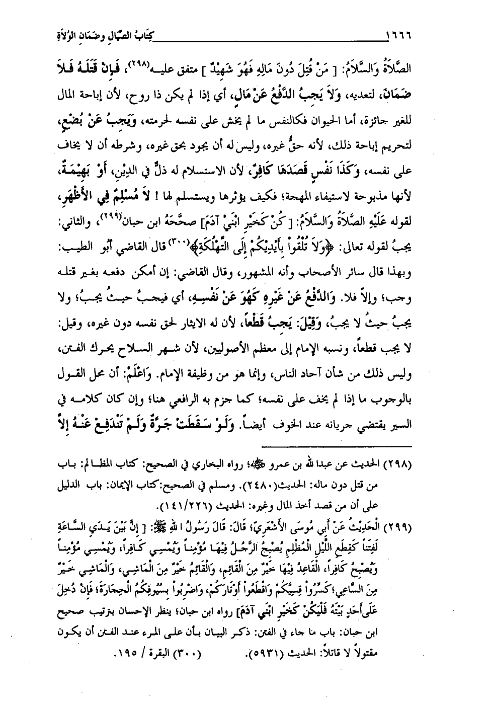 (¬298) الحديث عن عبد الله بن عمرو - رضي الله عنه -؛ رواه البخاري في الصحيح: كتاب المظالم: باب من قتل دون ماله: الحديث (2480). ومسلم في الصحيح: كتاب الإيمان: باب الدليل على أن من قصد أخذ المال وغيره: الحديث (226/ 141).