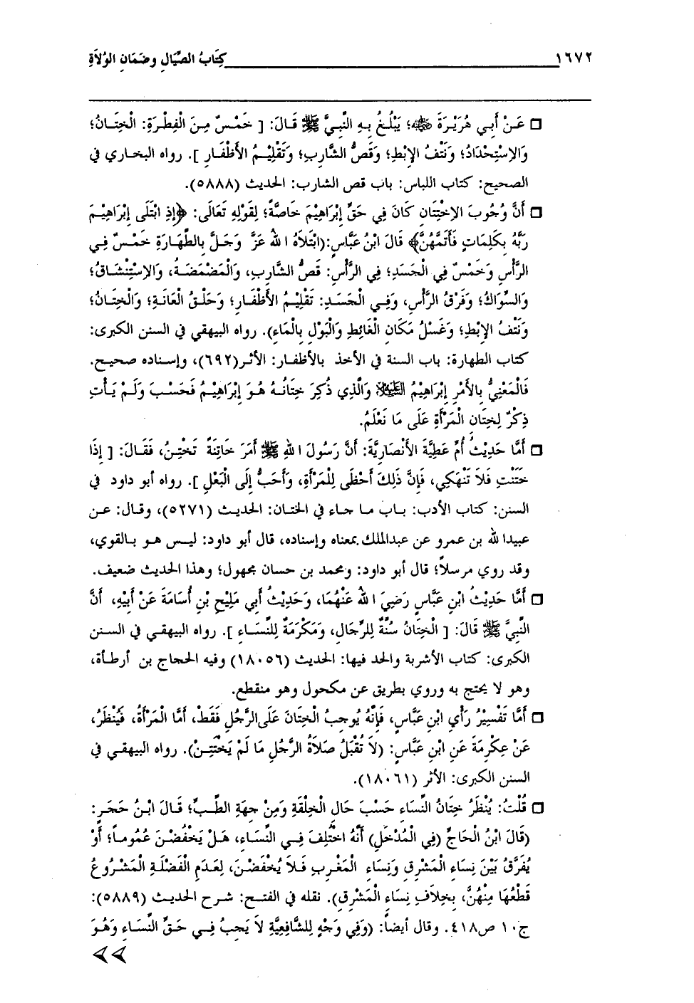 = • عَنْ أَبِي هُرَيْرَةَ - رضي الله عنه -؛ يَبْلُغُ بِهِ النَّبِيَّ - صلى الله عليه وسلم - قَالَ: [خَمْسٌ مِنَ الْفِطْرَةِ: الْخِتَانُ؛ وَالاِسْتِحْدَادُ؛ وَنَتْفُ الإِبْطِ؛ وَقَصُّ الشَّارِبِ؛ وَتَقْلِيْمُ الأَظْفَارِ]. رواه البخاري في الصحيح: كتاب اللباس: باب قص الشارب: الحديث (5888).
