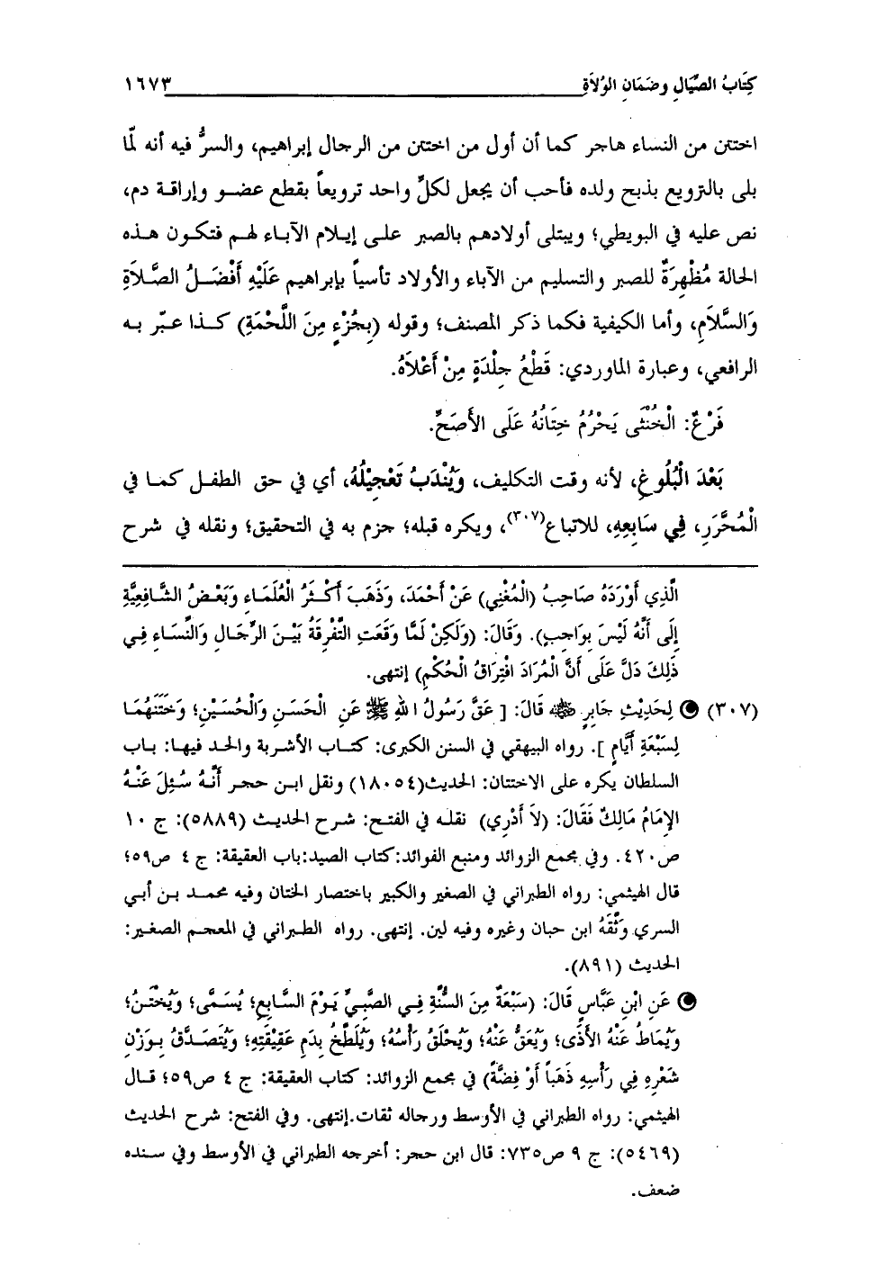 (¬307) • لِحَدِيْثِ جَابِر - رضي الله عنه - قَالَ: [عَقَّ رَسُولُ اللهِ - صلى الله عليه وسلم -عَنِ الْحَسَنِ وَالْحُسَيْنِ؛ وَخَتَنَهُمَا لِسَبْعَةِ أَيَّامٍ]. رواه البيهقي في السنن الكبرى: كتاب الأشربة والحد فيها: باب السلطان يكره على الاختتان: الحديث (18054) ونقل ابن حجر أَنَّهُ سُئِلَ عَنْهُ الإِمَامُ مَالِكٌ فَقَالَ: (لاَ أَدْرِي) نقله في الفتح: شرح الحديث (5889): ج 10 ص 420. وفي مجمع الزوائد ومنبع الفوائد: كتاب الصيد: باب العقيقة: ج 4 ص 59؛ قال الهيثمي: رواه الطبراني في الصغير والكبير باختصار الختان وفيه محمد بن أبي السري وَثَّقَهُ ابن حبان وغيره وفيه لين. إنتهى. رواه الطبراني في المعجم الصغير: الحديث (891).