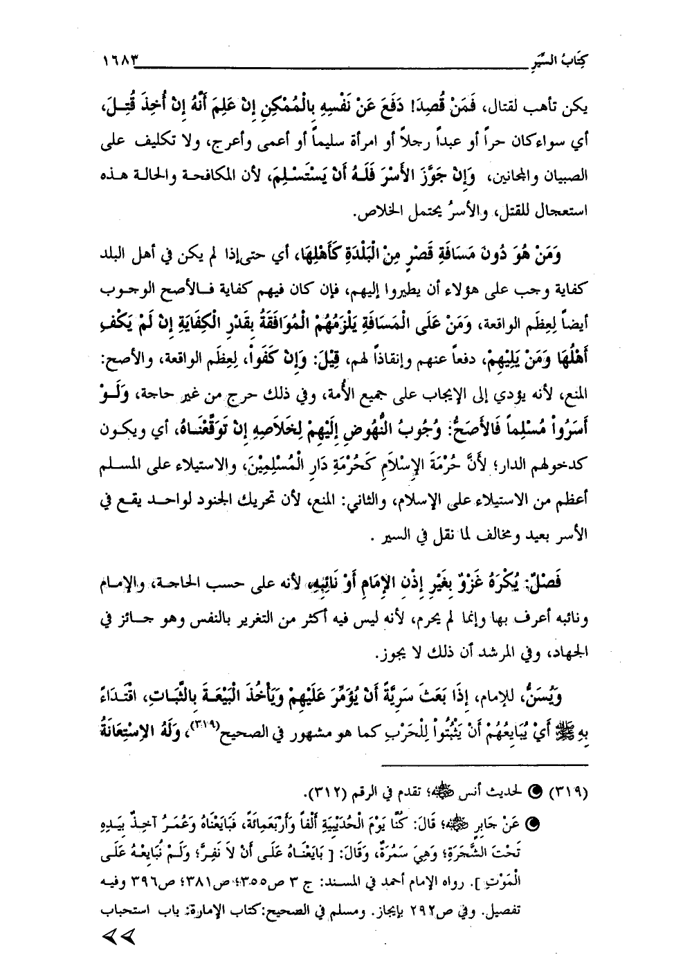 وَمَنْ هُوَ دُونَ مَسَافَةِ قَصْرٍ مِنْ الْبَلْدَةِ كَأَهْلِهَا، أي حتى إذا لم يكن في أهل البلد كفاية وجب على هؤلاء أن يطيروا إليهم، فإن كان فيهم كفاية فالأصح الوجوب أيضًا لِعِظَم الواقعة، وَمَنْ عَلَى الْمَسَافَةِ يَلْزَمُهُمْ الْمُوَافَقَةُ بِقَدْرِ الْكِفَايَةِ إِنْ لَمْ يَكْفِ أَهْلُهَا وَمَنْ يَلِيْهِمْ، دفعًا عنهم وإنفاذًا لهم، قِيْلَ: وَإِنْ كَفَواْ، لِعِظَم الواقعة، والأصح: المنع، لأنه يؤدي إلى الإيجاب على جميع الأُمة، وفي ذلك حرج من غير حاجة، وَلَوْ أَسَرُواْ مُسْلِمًا فَالأَصَحُّ: وُجُوبُ النُّهُوضِ إلَيْهِمْ لِخَلاَصِهِ إِنْ تَوَقَّعْنَاهُ، أي ويكون كدخولهم الدار؛ لأَنَّ حُرْمَةَ الإِسْلاَمِ كَحُرْمَةِ دَارِ الْمُسْلِمِيْنَ، والاستيلاء على المسلم أعظم من الاستيلاء على الإسلام، والثاني: المنع، لأن تحريك الجنود لواحد يقع في الأسر بعيد ومخالف لما نقل في السير.