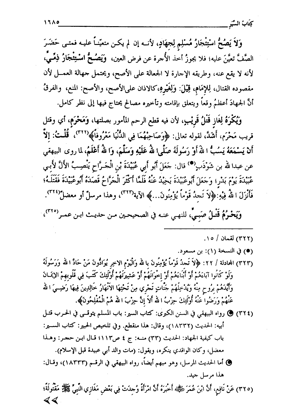 وَيُكْرَهُ لِغَازٍ قَتْلُ قَرِيْبٍ، لأن فيه قطع الرحم المأمور بصلتها، وَمَحْرَمٍ، أي وقتل قريب مَحْرَم، أَشَدَّ، لقوله تعالى: {وَصَاحِبْهُمَا في الدُّنْيَا مَعْرُوفًا} (¬322)، قُلْتُ: إِلَّا أَنْ يَسْمَعَهُ يَسُبُّ اللهَ أَوْ رَسُولَهُ صَلَّى الله عَلَيْهِ وَسَلَّمَ، وَاللهُ أَعْلَمُ، لما روى البيهقي عن عبد الله بن شَوْذَبٍ (•) قال: جَعَلَ أَبُو أَبِي عُبَيْدَةَ بْنِ الْجَرَّاحِ يَنْصِبُ الأَلَّ لأَبِي عُبَيْدَةَ يَوْمَ بَدْرٍ؛ وَجَعَلَ أَبُو عُبَيْدَةَ يَحِيْدُ عَنْهُ فَلَمَّا أكْثَرَ الْجَرَّاحُ قَصَدَهُ أَبُو عُبَيْدَةَ فَقَتَلَهُ؛ فَأَنْزَلَ اللهُ فِيْهِ: {لَا تَجِدُ قَوْمًا يُؤْمِنُونَ ... } الآية (¬323)، وهذا مرسلٌ أو معضلٌ (¬324).