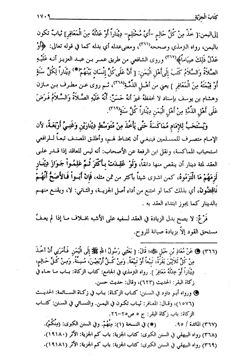 إلى اليمن: [خُذْ مِنْ كُلِّ حَالِمٍ - أَيْ مُحْتَلِمٍ - دِيْنَارًا أوْ عَدْلَهُ مِنَ الْمَعَافِرِ] ثيابٌ تكون باليمن، رواه الترمذي وصححه (¬366)، ومعنى عدله أي بدله كما في قوله تعالى: {أَوْ عَدْلُ ذَلِكَ صِيَامًا} (¬367) وروى الشافعي من طريق عمر بن عبد العزيز أنه عَلَيْهِ الصَّلاَةُ وَالسَّلاَمُ كَتَبَ إِلَى أَهْلِ الْيَمَنِ: [أَنَّ عَلَى كُلِّ إِنْسَانٍ بَيْنَهُمْ (•) دِيْنَارًا لِكُلِّ سَنَةٍ أَوْ قِيْمَتَهُ مِنَ الْمَعَافِرِ] يعني من أهْلِ الذِّمَّةِ (¬368)، ثم روى عن مطرف بن مازن وهشام بن يوسف بإسناد لا نحفظهُ غيرَ أنهُ حَسَنٌ: أَنَّهُ عَلَيْهِ الصَّلاَةُ وَالسَّلاَمُ فَرَضَ عَلَى أَهْلِ الذِّمَّةِ مِنْ أَهْلِ اليَمَنِ دِيْنَارًا كُلَّ سَنَةٍ (¬369).