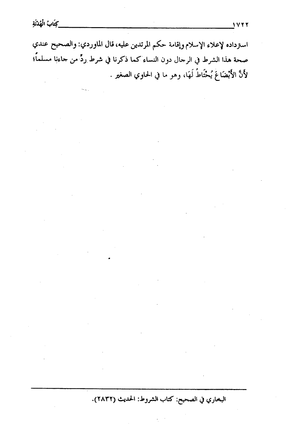 استرداده لإعلاء الإسلام وإقامة حكم المرتدين عليه، قال الماوردي: والصحيح عندي صحة هذا الشرط في الرجال دون النساء كما ذكرنا في شرط ردَّ من جاءنا مسلمًا؛ لأَنَّ الأَبْضَاعَ يُحْتَاطُ لَهَا، وهو ما في الحاوي الصغير.