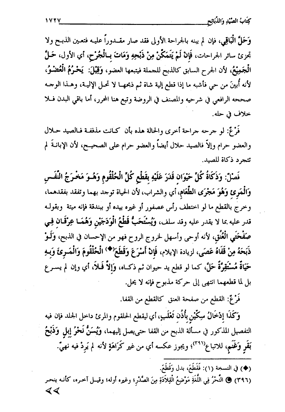 فَصْلٌ: وَذَكَاةُ كُلَّ حَيْوَانٍ قَدَرَ عَلَيْهِ بِقَطْعِ كُلَّ الحُلْقُومِ وَهُوَ مَخْرَجُ النَّفَسِ وَالمَرِئِ وَهُوَ مَجْرَى الطَّعَامِ، أي والشراب، لأن الحياة توجد بهما وتفقد بفقدهما، وخرج بالقطع ما لو اختطف رأس عصفور أو غيره بيده أو ببندقة فإنه ميتة وبقوله قدر عليه بما لا يقدر عليه وقد سلف، وَيُسْتَحَبُّ قَطْعُ الوَدَجَيْنِ وَهُمَا عِرْقَانِ فِي صَفْحَتَي الْعُنُقِ، لأنه أوحى وأسهل لخروج الروح فهو من الإحسان في الذبح، وَلَوْ ذَبَحَهُ مِنْ قَفَاهُ عَصَى، لزيادة الإيلام، فَإِنْ أَسْرَعَ وَقَطَعَ (•) الحُلْقُومَ وَالمَرِئ وَبِهِ حَيَاةٌ مُسْتَقِرَّةٌ حَلَّ، كما لو قطع يد حيوان ثم ذكاه، وِإلاّ فَلاَ، أي وإن لم يسرع بل لما قطعهما انتهى إلى حركة مذبوح فإنه لا يحل.