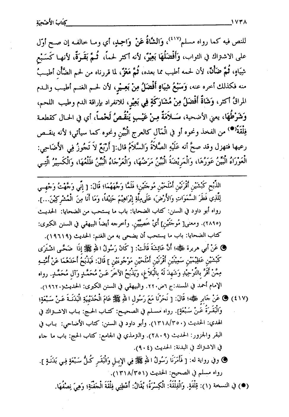 (¬417) • عَنْ جَابِرٍ - رضي الله عنه -؛ قَالَ: [نَحَرْنَا مَعَ رَسُولِ اللهِ - صلى الله عليه وسلم - عَامَ الْحُدَيْبِيَةِ الْبَدَنَةَ عَنْ سَبْعَةٍ؛ وَالْبَقَرَةُ عَنْ سَبْعَةٍ]. رواه مسلم في الصحيح: كتاب الحج: باب الاشتراك في الهدي: الحديث (350/ 1318). وأبو داود في السنن: كتاب الأضاحي: باب في البقر والجزور: الحديث (2809). والترمذي في الجامع: كتاب الحج: باب ما جاء في الاشتراك في البدنة: الحديث (904).
