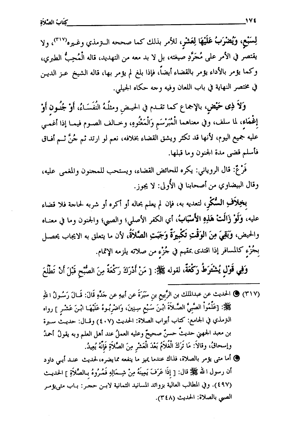 (¬317) • الحديث عن عبد الملك بن الرَّبِيع بنِ سَبَرَةَ عن أبيهِ عن جَدِّهِ قَالَ: قَالَ رَسُولُ اللهِ - صلى الله عليه وسلم -: [عَلِّمُواْ الصَّبِيَّ الصَّلاَةَ ابْنَ سَبْعِ سِنِينَ، وَاضْرِبُوهُ عَلَيْهَا ابْنَ عَشْرٍ] رواه الترمذي في الجامع: كتاب أبواب الصلاة: الحديث (407) وقال: حديث سبرة بن معبد الجهني حديثٌ حسنٌ صحيحٌ وعليه العملُ عند أهل العلم وبه يقولُ أحمدُ وإسحاقُ، وقالاَ: مَا تَرَكَ الْغُلاَمُ بَعْدَ الْعَشْرِ مِنَ الصَّلاَةِ فَإِنَّهُ يُعِيدُ.