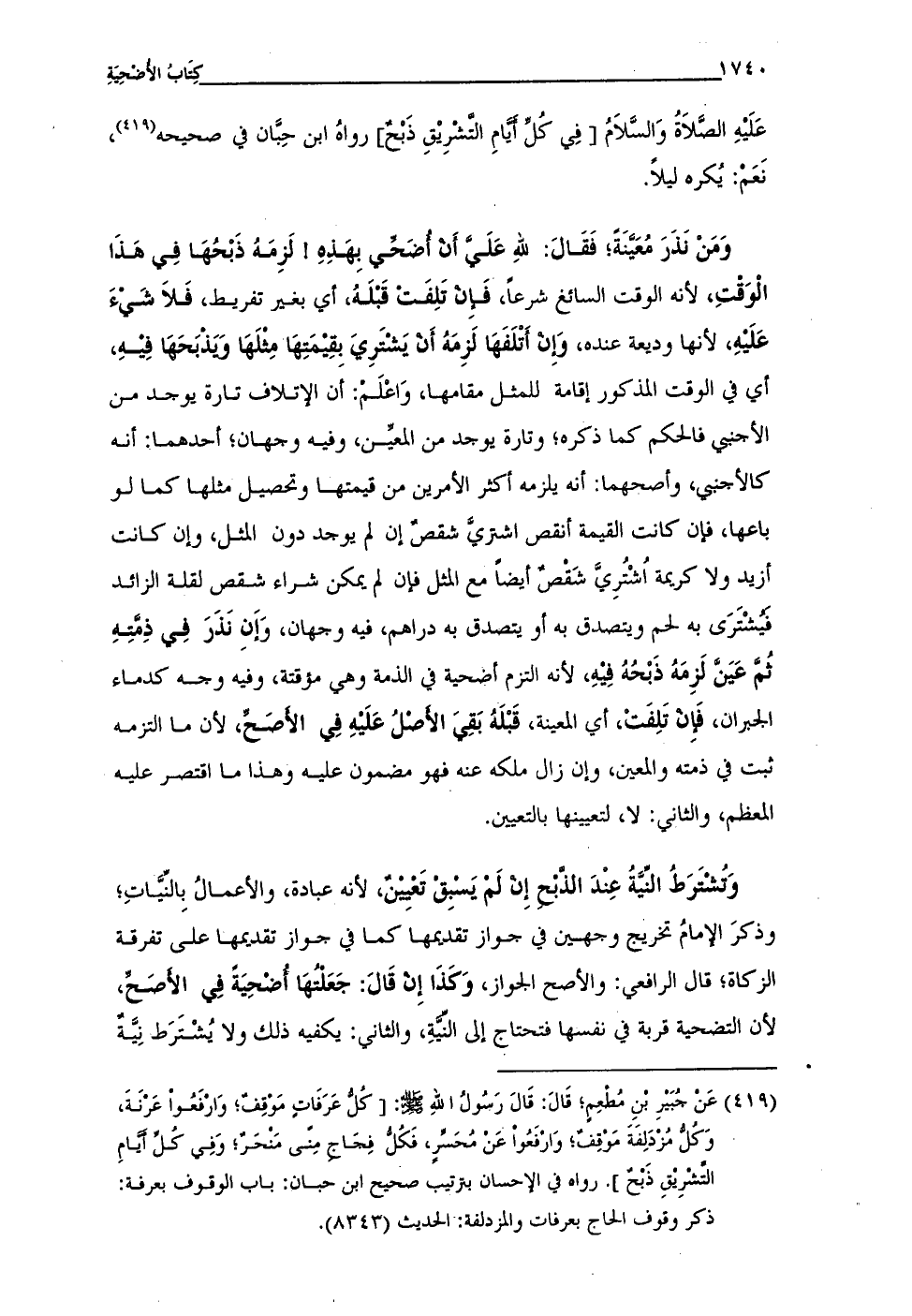 (¬419) عَنْ جُبَيْرِ بْنِ مُطْعِمٍ؛ قالَ: قَالَ رَسُولُ اللهِ - صلى الله عليه وسلم -: [كُلُّ عَرَفَاتٍ مَوقِفٌ؛ وَارْفَعُواْ عَرْنَةَ، وَكُلُّ مُزْدَلِفَةَ مَوْقِفٌ؛ وَارْفَعُواْ عَن مُحَسِّرٍ، فَكُلُّ فِحَاجِ مِنّى مَنحَرٌ؛ وَفِي كُلِّ أَيَّامِ التَّشْرِيْقِ ذَبْحٌ]. رواه فِي الإحسان بترتيب صحيح ابن حبان: باب الوقوف بعرفة: ذكر وقوف الحاج بعرفات والمزدلفة: الحديث (8343).