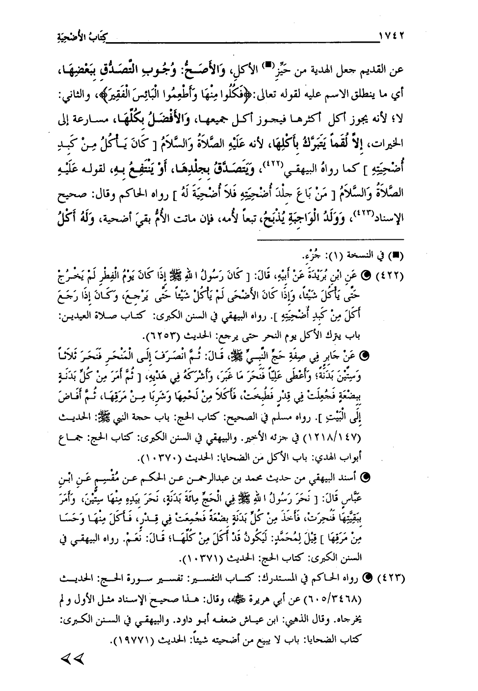 (¬423) • رواه الحاكم فِي المستدرك: كتاب التفسير: تفسير سورة الحج: الحديث (3468/ 605) عن أبي هريرة - رضي الله عنه -، وقال: هذا صحيح الإسناد مثل الأول ولم يخرجاه. وقال الذهبي: ابن عياش ضعفه أبو داود. والبيهقي فِي السنن الكبرى: كتاب الضحايا: باب لا يبيع من أضحيته شيئًا: الحديث (19771). =
