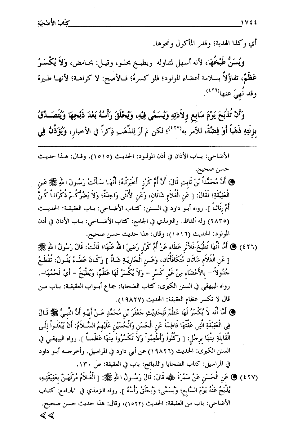 (¬426) • أمَّا أَنَّهَا تُطْبَخُ فَلأَثَرِ عَطَاءٍ عَنْ أُمِّ كَرْزٍ رَضِيَ اللهُ عَنْهَا؛ قَالَت: قَالَ رَسُولُ اللهِ - صلى الله عليه وسلم -[عَنِ الغُلَامِ شَاتَانِ مُتَكَافَأَتَانِ، وَعَنِ الجَارِيَةِ شَاةٌ] وَكانَ عَطَاءُ يَقُولُ: تُقْطَعُ جُدُولًا - بِالأَعْضَاءِ مِنْ غَيْرِ كَسْرٍ - وَلَا يُكْسَرُ لَهَا عَظْمٌ، وَيُطبَخُ - أَىْ لَحْمُهَا -. رواه البيهقي فِي السنن الكبرى: كتاب الضحايا: جماع أبواب العقيقة: باب من قال لا تكسر عظام العقيقة: الحديث (19827).