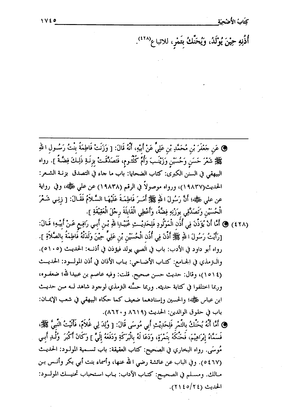 (¬428) • أَمَّا أَنْ يُؤَذَّنَ فِي أُذُنِ الْمَوْلُودِ فَلِحَدِيثِ عُبَيْدِ اللهِ بْنِ أبِي رَافِعٍ عَنْ أبِيْهِ؛ قالَ: [رَأَيْتُ رسُولَ اللهِ - صلى الله عليه وسلم - أَذَّنَ فِي أُذُنِ الحُسَيْنِ بْنِ عَلِيٍّ حِيْنَ وَلَدَتْهُ فاطِمَةُ بِالصَّلَاةِ]. رواه أبو داود فِي الأدب: باب فِي الصبي يولد فيؤذن فِي أذنه: الحديث (5105). والترمذي فِي الجامع: كتاب الأضاحي: باب الأذان فِي أذن المولود: الحديث (1514)، وقال: حديث حسن صحيح. قلت: وفيه عاصم بن عبيد الله؛ ضعفوه، وربما اختلفوا فِي كتابة حديثه. وربما حسَّنه الترمذي لوجود شاهد له من حديث ابن عباس - رضي الله عنه -؛ والحسين وإسنادهما ضعيف كما حكاه البيهقي فِي شعب الإيمان: باب فِي حقوق الوالدين: الحديث (8619 و 8620).