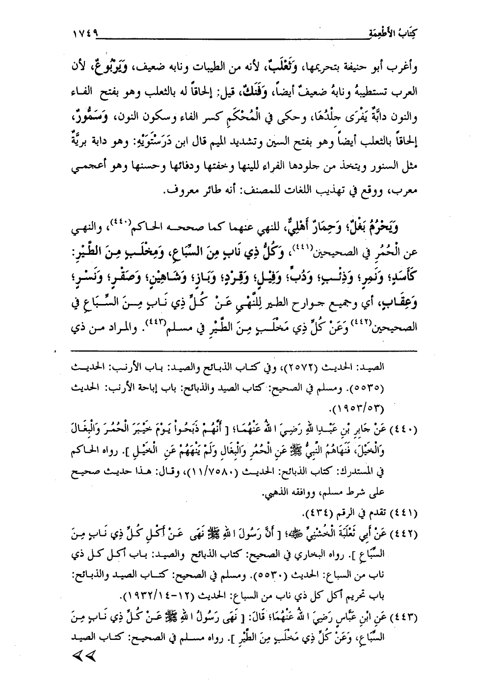(¬442) عَنْ أَبِي ثَعْلَبَةَ الْخُشْنِيَّ - رضي الله عنه -؛ [أنَّ رَسُولَ الله - صلى الله عليه وسلم - نَهَى عَنْ أَكْلِ كُلَّ ذِي نَابٍ مِنَ السَّبَاعِ]. رواه البخاري في الصحيح: كتاب الذبائح والصيد: باب أكل كل ذي ناب من السباع: الحديث (5530). ومسلم في الصحيح: كتاب الصيد والذبائح: باب تحريم أكل كل ذي ناب من السباعِ: الحديث (12 - 14/ 1932).