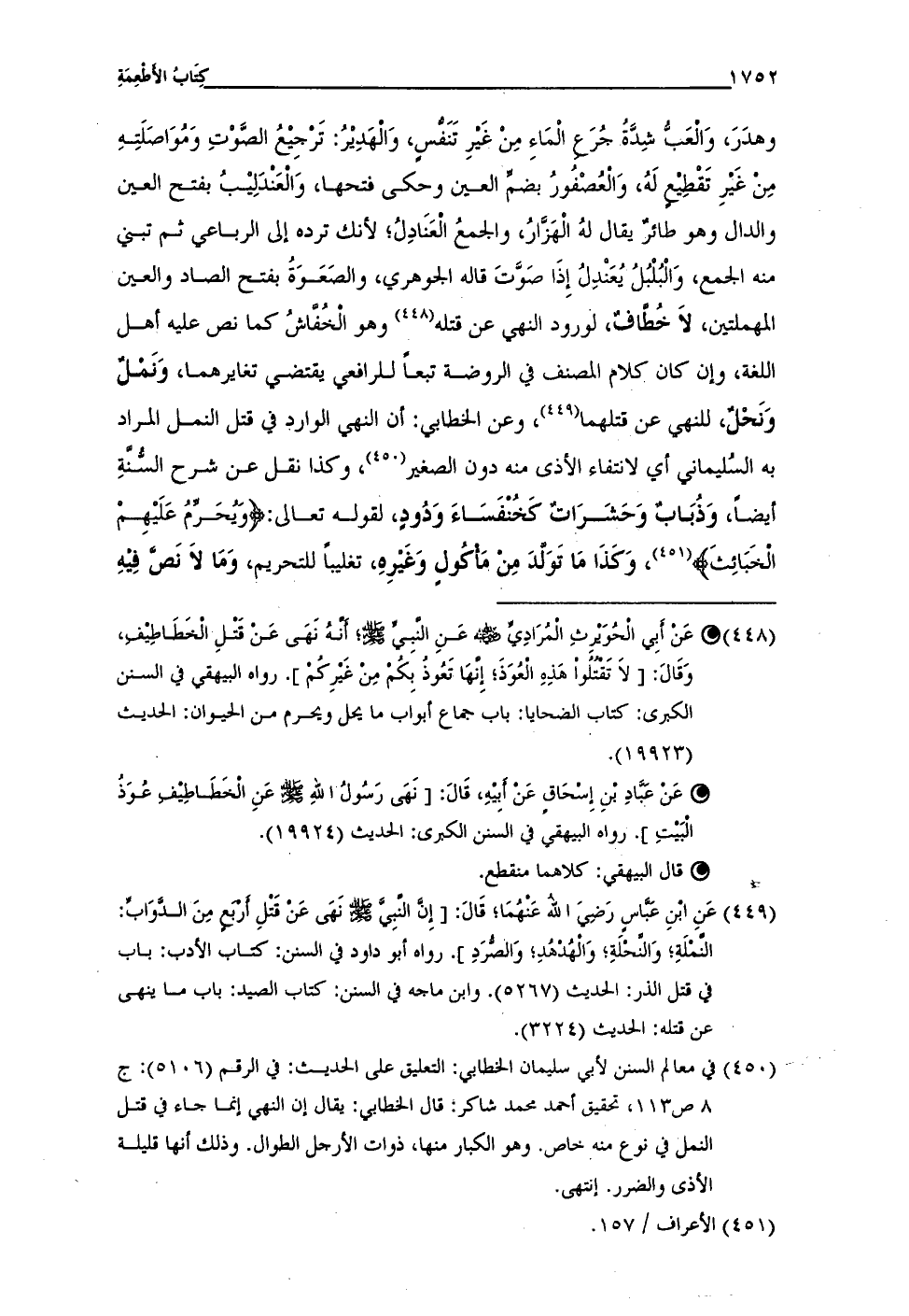 (¬450) في معالم السنن لأبي سليمان الخطابي: التعليق على الحديث: في الرقم (5106): ج 8 ص 113، تحقيق أحمد محمد شاكر: قال الخطابي: يقال إن النهي إنما جاء في قتل النمل في نوع منه خاص. وهو الكبار منها، ذوات الأرجل الطوال. وذلك أنها قليلة الأذى والضرر. إنتهى.