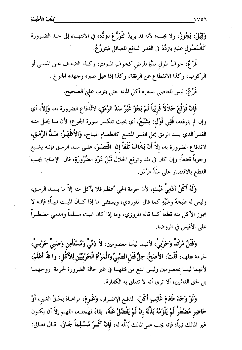 وَقِيْلَ: يَجُوزُ، ولا يجب؛ لأنه قد يريدُ التَّوَرُّعَ لتردُّده في الانتهاء إلى حد الضرورة كَالْمَصُولِ عليهِ يتردَّدُ في القدر الدافع للصائل فيتورَّعُ.
