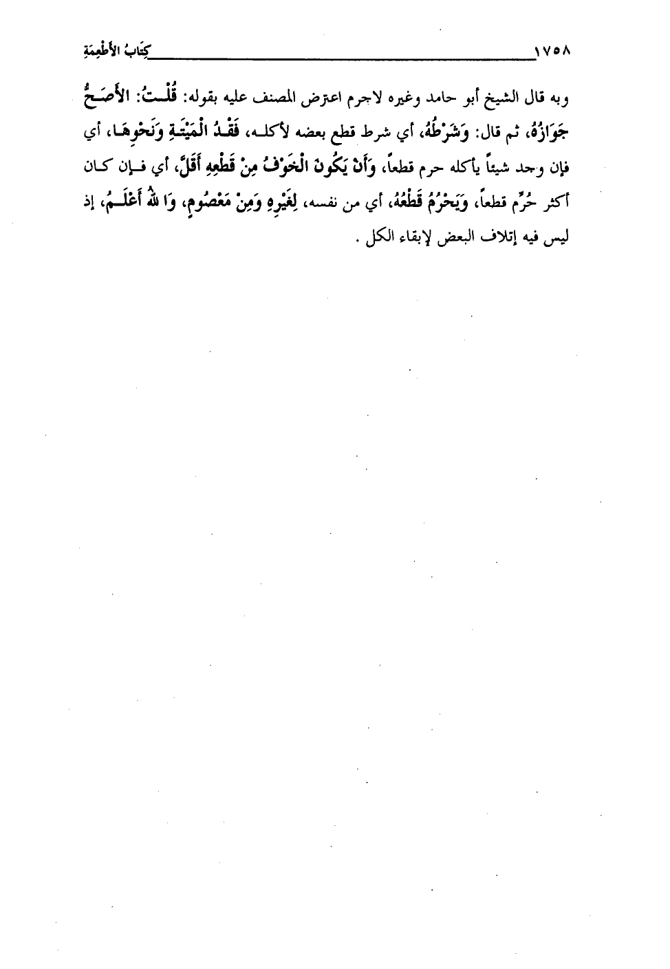 وبه قال الشيخ أبو حامد وغيره لا جرم اعترض المصنف عليه بقوله: قُلْتُ: الأَصَحُّ جَوَازُهُ، ثم قال: وَشَرْطُهُ، أي شرط قطع بعضه لأكله، فَقْدُ الْمَيْتَةِ وَنَحْوِهَا، أي فإن وجد شيئًا يأكله حرم قطعًا، وَأَنْ يَكُونَ الْخَوْفُ مِنْ قَطْعِهِ أَقَلَّ، أي فإن كان أكثر حُرَّم قطعًا، وَيَحْرُمُ قَطْعُهُ، أي من نفسه، لِغَيْرِهِ وَمِنْ مَعصُومٍ، وَاللهُ أَعْلَمُ، إذ ليس فيه إتلاف البعض لإبقاء الكل.