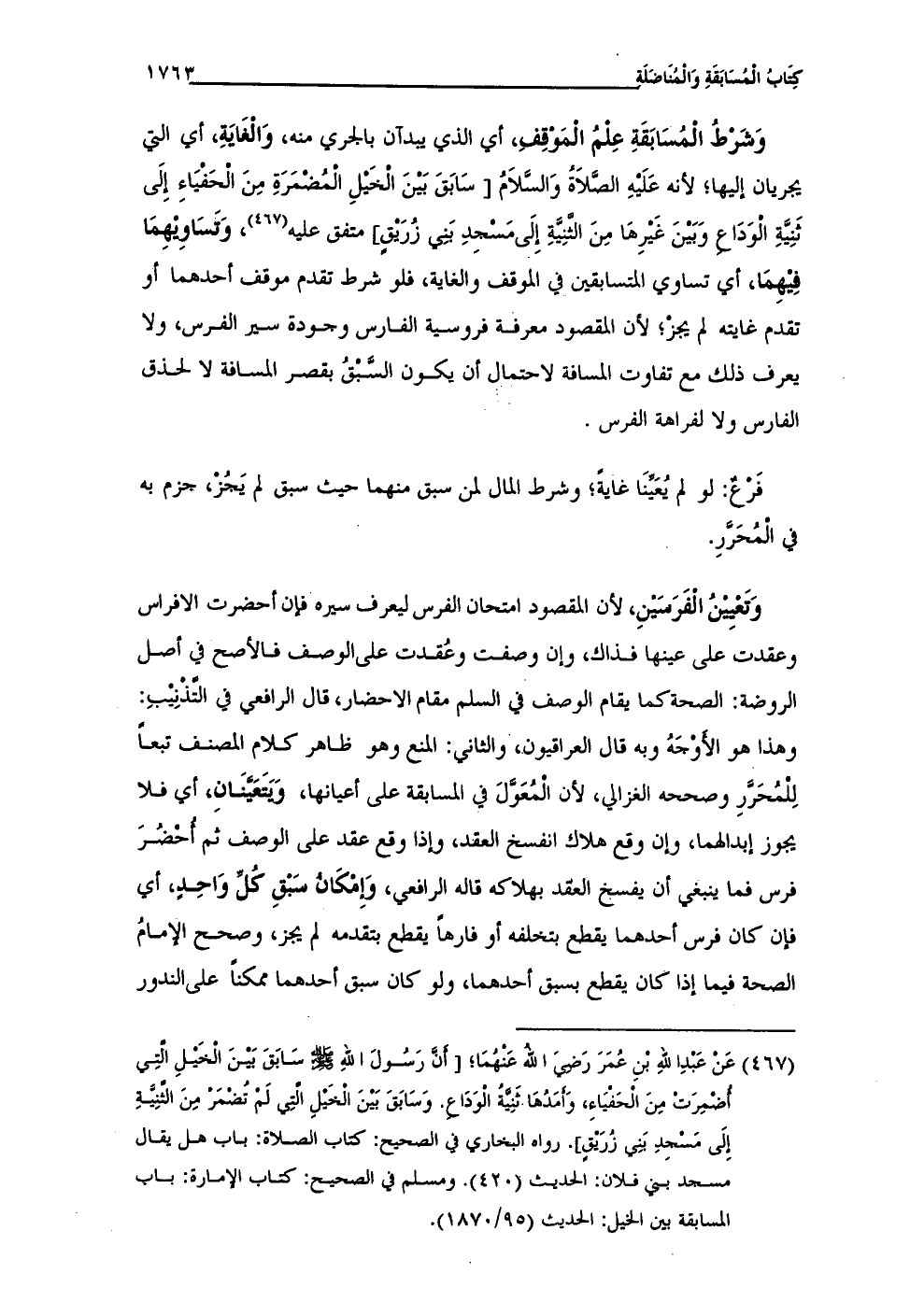 وَشَرْطُ الْمُسَابَقَةِ عِلْمُ الْمَوْقِفِ، أي الذي يبدآن بالجري منه، وَالْغَايَةِ، أي التي يجريان إليها؛ لأنه عَلَيْهِ الصَّلاَةُ وَالسَّلاَمُ [سَابَقَ بَيْنَ الْخَيْلِ الْمُضْمَرَةِ مِنَ الْحَفْيَاءِ إِلَى ثَنِيَّةِ الْوَدَاع وَبَيْنَ غَيْرِهَا مِنَ الثَّنِيَّةِ إِلَى مَسْجِدِ بَنِي زُرَيْقٍ] متفق عليه (¬467)، وَتَسَاوِيْهِمَا فِيْهِمَا، أي تساوي المتسابقين في الموقف والغاية، فلو شرط تقدم موقف أحدهما أو تقدم غايته لم يجزْ؛ لأن المقصود معرفة فروسية الفارس وجودة سير الفرس، ولا يعرف ذلك مع تفاوت المسافة لاحتمال أن يكون السَّبْقُ بقصر المسافة لا لحذق الفارس ولا لفراهة الفرس.