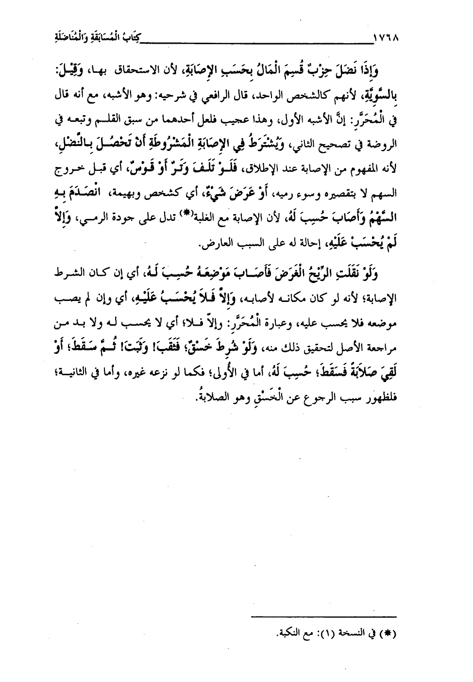 وَإِذَا نَضَلَ حِزْبٌ قُسِمَ الْمَالُ بِحَسَبِ الإِصَابَةِ، لأن الاستحقاق بها، وَقِيْلَ: بِالسَّويَّةِ، لأنهم كالشخص الواحد، قال الرافعي في شرحيه: وهو الأشبه، مع أنه قال في الْمُحَرَّرِ: إنَّ الأشبه الأول، وهذا عجيب فلعل أحدهما من سبق القلم وتبعه في الروضة في تصحيح الثاني، وَيُشْتَرَطُ فِي الإِصَابَةِ الْمَشْرُوطَةِ أَنْ تَحْصُلَ بِالنَّضْلِ، لأنه المفهوم من الإصابة عند الإطلاق، فَلَوْ تَلَفَ وَتَرٌ أوْ قَوْسٌ، أي قبل خروج السهم لا بتقصيره وسوء رميه، أَوْ عَرَضَ شَيْءٌ، أى كشخص وبهيمة، انْصَدَمَ بِهِ السَّهْمُ وَأَصَابَ حُسِبَ لَهُ، لأن الإصابة مع الغلبة (•) تدل على جودة الرمي، وَإِلاَّ لَمْ يُحْسَبْ عَلَيْهِ، إحالة له على السبب العارض.