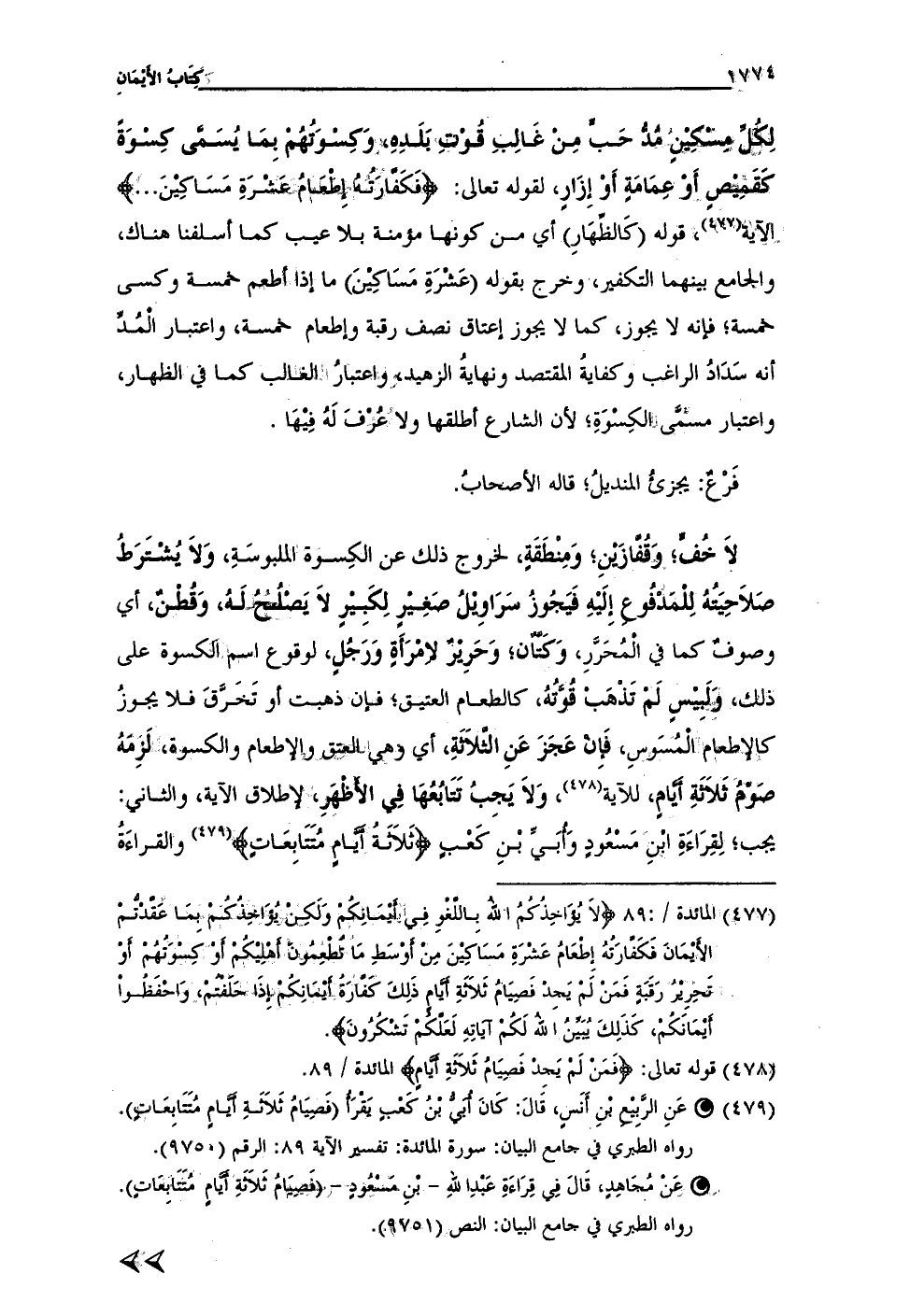 (¬477) المائدة / 89: {لَا يُؤَاخِذُكُمُ اللَّهُ بِاللَّغْوِ فِي أَيْمَانِكُمْ وَلَكِنْ يُؤَاخِذُكُمْ بِمَا عَقَّدْتُمُ الْأَيْمَانَ فَكَفَّارَتُهُ إِطْعَامُ عَشَرَةِ مَسَاكِينَ مِنْ أَوْسَطِ مَا تُطْعِمُونَ أَهْلِيكُمْ أَوْ كِسْوَتُهُمْ أَوْ تَحْرِيرُ رَقَبَةٍ فَمَنْ لَمْ يَجِدْ فَصِيَامُ ثَلَاثَةِ أَيَّامٍ ذَلِكَ كَفَّارَةُ أَيْمَانِكُمْ إِذَا حَلَفْتُمْ وَاحْفَظُوا أَيْمَانَكُمْ كَذَلِكَ يُبَيِّنُ اللَّهُ لَكُمْ آيَاتِهِ لَعَلَّكُمْ تَشْكُرُونَ}.