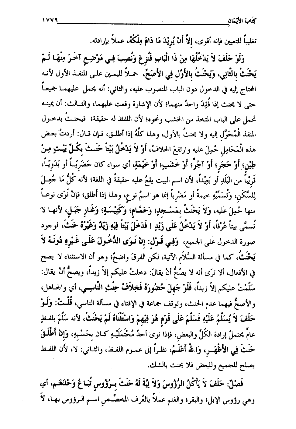 وَلَوْ حَلَفَ لَا يَدْخُلُهَا مِنْ ذَا الْبَابِ فَنُزِعَ وَنُصِبَ فِي مَوْضِعٍ آخَرَ مِنْهَا لَمْ يَحْنَثْ بِالثَّانِي، وَيحْنَثُ بِالأَوَّلِ في الأَصَحِّ، حملًا لليمين على المنفذ الأول لأنه المحتاج إليه في الدخول دون الباب المنصوب عليه، والثاني: أنَّه يحمل عليهما جميعًا حتَّى لا يحنث إذا فُقِدَ واحدٌ منهما؛ لأن الإشارة وقعت عليهما، والثالث: أن يمينه تحمل على الباب المتخذ من الخشب ونحوه؛ لأن اللفظ له حقيقة، فيحنثُ بدخول المنفذ الْمُحَوَّلِ إليه ولا يحنثُ بالأول، وهذا كلُّهُ إذا أطلق، فإن قال: أردتُ بعض هذه الْمَحَامِلِ حُمِلَ عليه وارتفعَ الخلافُ، أَوْ لَا يَدْخُلُ بَيْتًا حَنَثَ بِكُلِّ بَيْتٍ مِنْ طِيْنٍ؛ أوْ حَجَرٍ؛ أَوْ آجُرٍّ؛ أَوْ خَشَبٍ؛ أَوْ خَيْمَةٍ، أي سواء كان حَضَرِيًّا أو بَدَوِيًّا، قَرِيْبًّا من البَلَدِ أو بَعِيْدًا, لأن اسم البيت يقعُ عليه حقيقةً في اللغة؛ لأنه كُلُّ مَا جُعِلَ لِلسَّكَنِ، وَتُسَمَّيْهِ خيمةً أو مَضْرِبًا إنما هو اسمُ نوعٍ، وهذا إذا أَطلق؛ فإنْ نَوَى نوعًا منها حُمِلَ عليه، وَلَا يَحْنَثُ بِمَسْجِدٍ؛ وَحَمَّامٍ؛ وَكَنِيسَةٍ؛ وَغَارِ جَبَلٍ, لأنها لا تُسمَّى بيتًا عُرْفًا، أوْ لَا يَدْخُلُ عَلَى زَيْدٍ! فَدَخَلَ بَيْتًا فِيْهِ زَيْدٌ وَغَيرُهُ حَنَثَ، لوجود صورة الدخول على الجميع، وَفِي قَوْلٍ: إِنْ نَوَى الدُّخُولَ عَلَى غَيْرِهِ دُونَهُ لَا يَحْنَثُ، كما في مسألة السَّلَامِ الآتية، لكن الفرقَ واضحٌ؛ وهو أن الاستثناء لا يصح في الأفعال، ألا ترَى أنَّه لا يصُحُّ أنْ يقالَ: دخلتُ عليكم إلاّ زيدًا، ويصحُّ أنْ يقال: سَلَّمْتُ عليكم إلاّ زيدًا، فَلَوْ جَهِلَ حُضُورَهُ فَخِلَافُ حِنْثِ النَّاسِي، أي والجاهل، والأصحُّ فيهما عدم الحنث، وتوقف جماعة في الإفتاء لها مسألة الناسي، قُلْتُ: وَلَوْ حَلَفَ لا يُسَلَّمُ عَلَيْهِ فَسَلَّمَ عَلَى قَوْمٍ هُوَ فِيْهِمْ وَاسْتَثْنَاهُ لَمْ يَحْنَثْ, لأنه سَلَّمَ بلفظٍ عامٍّ يحتملُ إرادة الكُلِّ والبعضِ، فإذا نوى أحدُ مُحْتَمَلَيْهِ كان بِحَسْبِهِ، وَإِن أَطْلَقَ حَنَثَ في الأظْهَرِ، وَاللهُ أَعْلَمُ، نظرًا إلى عموم اللفظ، والثاني: لا, لأن اللفظ يصلح للجميع وللبعض فلا يحنث بالشك.