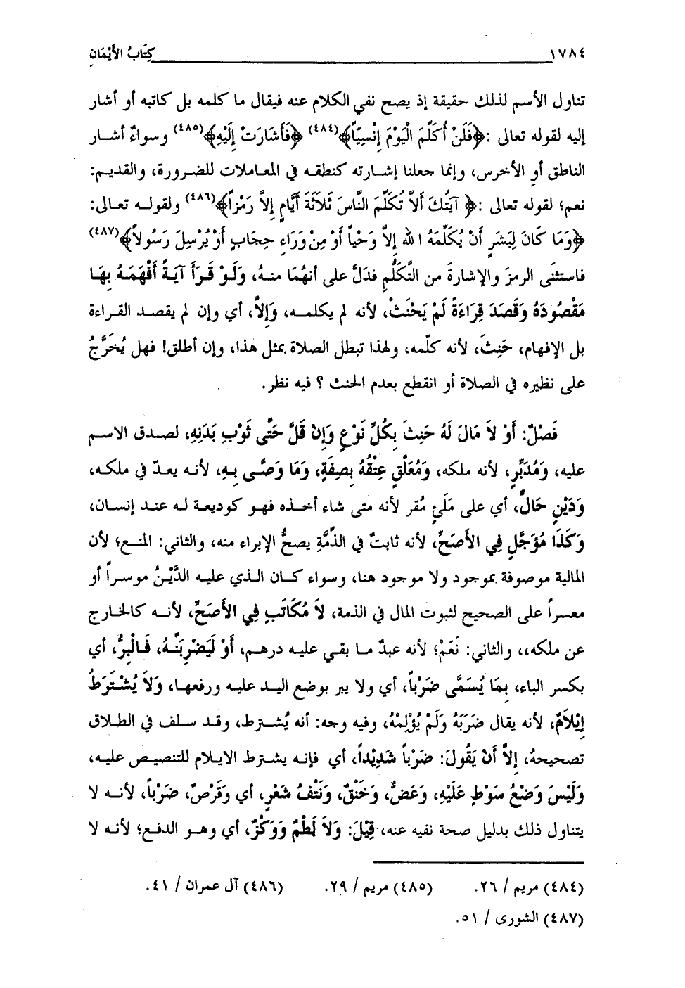 تناول الأسم لذلك حقيقة إذ يصح نفي الكلام عنه فيقال ما كلمة بل كاتبه أو أشار إليه لقوله تعالى: {فَلَنْ أُكَلِّمَ الْيَوْمَ إِنْسِيًّا} (¬484) {فَأَشَارَتْ إِلَيْهِ} (¬485) وسواءٌ أشار الناطق أوِ الأخرس، وإنما جعلنا إشارته كنطقه في المعاملات للضرورة، والقديم: نعم؛ لقوله تعالى: {آيَتُكَ أَلَّا تُكَلِّمَ النَّاسَ ثَلَاثَةَ أَيَّامٍ إِلَّا رَمْزًا} (¬486) ولقوله تعالى: {وَمَا كَانَ لِبَشَرٍ أَنْ يُكَلِّمَهُ اللَّهُ إِلَّا وَحْيًا أَوْ مِنْ وَرَاءِ حِجَابٍ أَوْ يُرْسِلَ رَسُولًا} (¬487) فاستثنَى الرمزَ والإشارةَ من التَّكَلُّمِ فدَلَّ على أنهُمَا منهُ، وَلَوْ قَرَأَ آيَةً أَفْهَمَهُ بِهَا مَقْصُودَهُ وَقَصَدَ قِرَاءَةً لَم يَحْنَثْ, لأنه لم يكلمه، وَإِلَّا، أي وإن لم يقصد القراءة بل الإفهام، حَنِثَ, لأنه كلّمه، ولهذا تبطل الصلاة بمثل هذا، وإن أطلق! فهل يُخَرَّجُ على نظيره في الصلاة أو انقطع بعدم الحنث؟ فيه نظر.