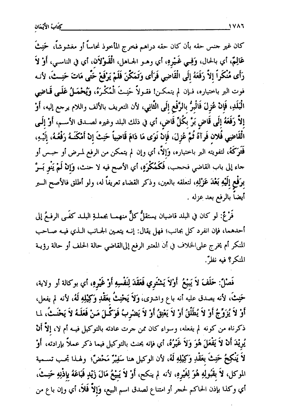 كان غير جنس حقه بأن كان حقه دراهم فخرج المأخوذ نحاسًا أو مغشوشًا، حَنِثَ عَالِمٌ، أي بالحال، وَفِي غَيْرِهِ، أي وهو الجاهل، الْقَوْلَانِ، أي في الناسي، أَوْ لَا رَأَى مُنْكَرًا إِلَّا رَفَعَهُ إِلَى الْقَاضِي فَرَأَى وَتَمَكَّنَ فَلَمْ يَرْفَعْ حَتَّى مَاتَ حَنِثَ, لأنه فوت البر باختياره، فإن لم يتمكن! فقولًا حَنِثَ الْمُكْرَهُ، ويُحْمَلُ عَلَى قَاضِي الْبَلَدِ، فَإِنْ عُزِلَ فَالْبِرُّ بالرَّفْعِ إِلَى الثَّانِي, لأن التعريف بالألف واللام يرجع إليه، أَوْ إِلَّا رَفَعَهُ إِلَى قَاضٍ بَرَّ بِكُلِّ قَاضٍ، أي في ذلك البلد وغيره لصدق الاسم، أَوْ إِلى الْقَاضِي فُلانٍ فَرآهُ ثُمَّ عُزِلَ، فَإنْ نَوَى مَا دَامَ قَاضِيًا حَنِثَ إِنْ أَمْكَنَهُ رَفْعُهُ، إِلَيْهِ، فَتَرَكَهُ، لتفويته البر باختياره، وَإِلَّا، أي وإن لم يتمكن من الرفع لمرض أو حبس أو جاء إلى باب القاضي فحجب، فَكَمُكْرَهٍ، أي الأصح فيه لا حنث، وَإِنْ لَمْ يَنْوِ بَرَّ بِرَفْعٍ إِلَيهِ بَعْدَ عَزْلِهِ، لتعلقه بالعين، وذكر القضاء تعريفًا له، ولو أطلق فالأصح البر أَيضًا بالرفع بعد عزله.