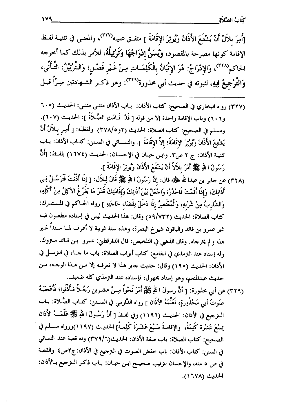ومسلم في الصحيح: كتاب الصلاة: الحديث (2 و 5/ 378) ولفظه: [أُمِرَ بِلاَلٌ أَنْ يَشْفِعَ الأَذَانَ وَيُوتِرَ الإِقَامَةَ؛ إِلاَّ الإِقَامَةَ]. والنسائي في السنن: كتاب الأذان: باب تثنية الأذان: ج 2 ص 3. وابن حبان في الإحسان: الحديث (1674) بلفظ: [أَنَّ رَسُولَ اللهِ - صلى الله عليه وسلم - أمَرَ بِلاَلاً أَنْ يَشْفَعَ الأَذَانَ وَيُوتِرَ الإِقَامَةَ].