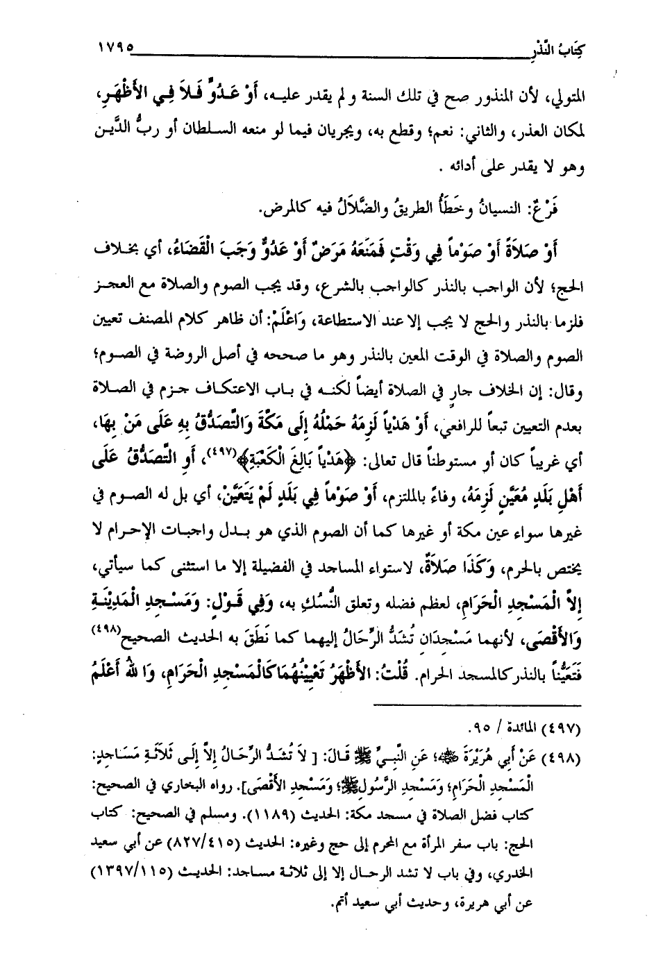 أَوْ صَلَاةً أَوْ صَوْمًا فِي وَقْتٍ فَمَنَعَهُ مَرَضٌ أَوْ عَدُوٌّ وَجَبَ القَضَاءُ، أي بخلاف الحج؛ لأن الواجب بالنذر كالواجب بالشرع، وقد يجب الصوم والصلاة مع العجز فلزما بالنذر والحج لا يجب إلا عند الاستطاعة، وَاعْلَمْ: أن ظاهر كلام المصنف تعيين الصوم والصلاة في الوقت المعين بالنذر وهو ما صححه في أصل الروضة في الصوم؛ وقال: إن الخلاف جارٍ في الصلاة أيضًا لكنه في باب الاعتكاف جزم في الصلاة بعدم التعيين تبعًا للرافعي، أَوْ هَدْيًا لَزِمَهُ حَمْلُهُ إِلَى مَكَّةَ وَالتَّصَدُّقُ بِهِ عَلَى مَنْ بِهَا، أي غريبًا كان أو مستوطنًا قال تعالى: {هَدْيًا بَالِغَ الْكَعْبَةِ} (¬497)، أَوِ التَّصَدُّقُ عَلَى أَهْلِ بَلَدٍ مُعَيَّنٍ لَزِمَهُ، وفاءً بالملتزم، أو صَوْمًا فِي بَلَدٍ لَم يَتَعَيَّنْ، أي بل له الصوم في غيرها سواء عين مكة أو غيرها كما أن الصوم الذي هو بدل واجبات الإحرام لا يختص بالحرم، وَكَذَا صَلَاةٌ، لاستواء المساجد في الفضيلة إلا ما استثنى كما سيأتي، إِلّا الْمَسْجِدِ الْحَرَامِ، لعظم فضله وتعلق النُّسُكِ به، وَفِي قَوْلٍ: وَمَسْجِدِ الْمَدِيْنَةِ وَالأَقْصَى، لأنهما مَسْجِدَانِ تُشَدُّ الرِّحَالُ إليهما كما نَطَقَ به الحديث الصحيح (¬498) فَتَعَيُّنًا بالنذر كالمسجد الحرام. قُلْتُ: الأَظْهَرُ تَعْيِيْنُهُمَا كاَلْمَسْجِدِ الْحَرَامِ، وَاللهُ أَعْلَمُ
