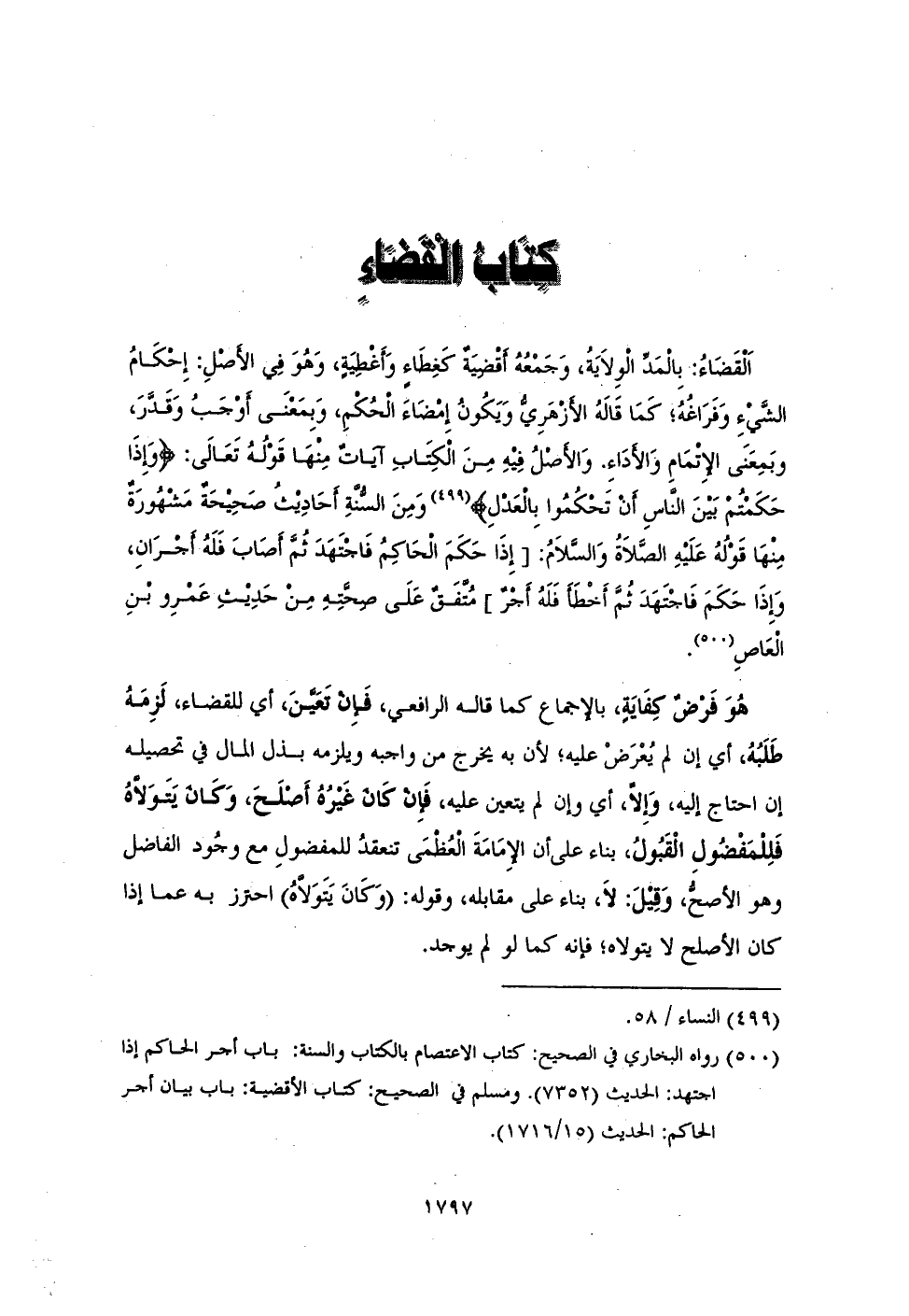 الْقَضَاءُ: بِالْمَدِّ الْوِلاَيَةُ، وَجَمْعُه أَقْضِيَةٌ كَغِطَاءٍ وَأَغْطِيةٍ، وَهُوَ فِي الأَصْلِ: إِحْكَامُ الشَّيْءِ وَفَرَاغُهُ؛ كَمَا قَالَهُ الأَزْهَرِيُّ وَيَكُونُ إِمْضَاءَ الحُكْمِ، وبِمَعْنَى أوْجَبُ وَقَدَّرَ، وبَمِعَنَى الإِتْمَامِ وَالأَدَاءِ. وَالأَصْلُ فِيْهِ مِنَ الكِتَابِ آيَاتٌ مِنْهَا قَوْلُهُ تَعَالَى: {وَإِذَا حَكَمْتُمْ بَيْنَ النَّاسِ أَنْ تَحْكُمُوا بِالْعَدْلِ} (¬499) وَمِنَ السُّنَّةِ أحَادِيْثُ صَحِيْحَة مَشْهُورَةٌ مِنْهَا قَوْلُهُ عَلَيهِ الصَّلاَةُ وَالسَّلاَمُ: [إِذَا حَكَمَ الْحَاكِمُ فَاجْتَهَدَ ثُمَّ أَصَابَ فَلَهُ أجْرَانِ، وَإِذَا حَكَمَ فَاجْتَهَدَ ثُمَّ أَخْطَأَ فَلَهُ أَجْرٌ] مُتَّفَقٌ عَلَى صِحَّتِهِ مِنْ حَدِيْثِ عَمْرِو بْنِ الْعَاصِ (¬500).