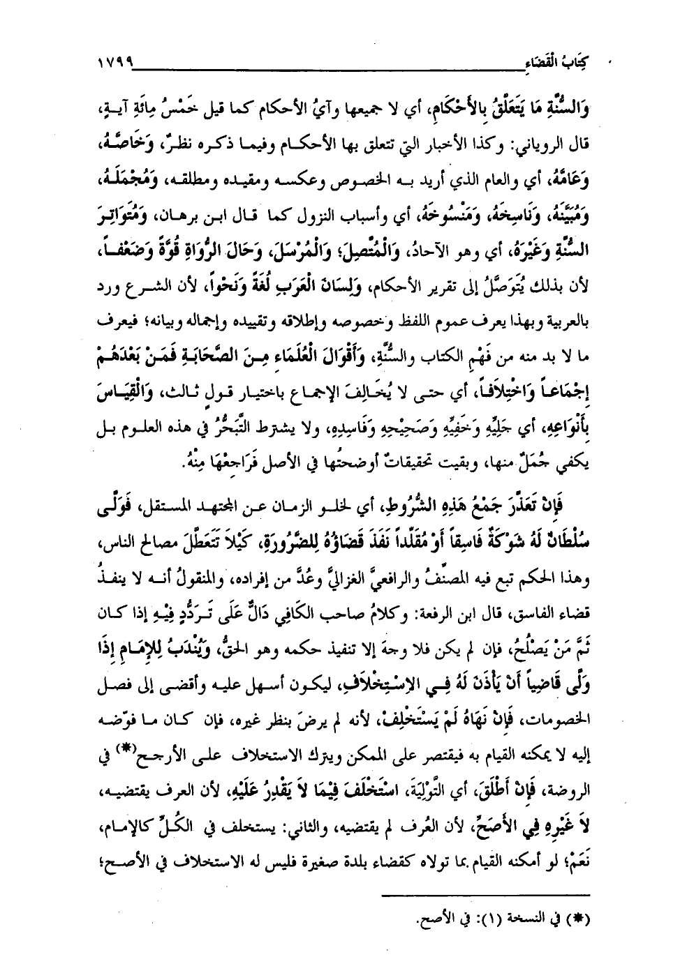 وَالسُّنَّةِ مَا يَتَعَلَّقُ بِالأَحْكَامِ، أي لا جميعها وآيُ الأحكام كما قيل خَمْسُ مِائَةِ آيةٍ، قال الروياني: وكذا الأخبار التي تتعلق بها الأحكام وفيما ذكره نظرٌ، وَخَاصَّهُ، وَعَامَّهُ، أي والعام الذي أريد به الخصوص وعكسه ومقيده ومطلقه، وَمُجْمَلَهُ، وَمُبَيَّنَهُ، وَنَاسِخَهُ، وَمَنْسُوخَهُ، أي وأسباب النزول كما قال ابن برهان، وَمُتَوَاتِرَ السُّنَّةِ وَغَيْرَهُ، أي وهو الآحادُ، وَالْمُتَّصِلَ؛ وَالْمُرْسَلَ، وَحَالَ الرُّوَاةِ قُوَّةً وَضَعْفًا، لأن بذلك يُتَوَصَّلُ إلى تقرير الأحكام، وَلِسَان الْعَرَبِ لُغَةً وَنَحْوًا، لأن الشرع ورد بالعربية وبهذا يعرف عموم اللفظ وخصوصه وإطلاقه وتقييده وإجماله وبيانه؛ فيعرف ما لا بد منه من فَهْمِ الكتاب والسُّنَّةِ، وَأَقْوَالَ الْعُلَمَاءِ مِنَ الصَّحَابَةِ فَمَنْ بَعْدَهُمْ إِجْمَاعًا وَاخْتِلاَفًا، أي حتى لا يُخَالِفَ الإجماع باختيار قولِ ثالث، وَالْقِيَاسَ بِأَنْوَاعِهِ، أي جَلِيِّهِ وَخَفِيِّهِ وَصَحِيْحِهِ وَفَاسِدِهِ، ولا يشترط التَّبَحُّرُ في هذه العلوم بل يكفي جُمَلٌ منها، وبقيت تحقيقاتٌ أوضحتُها فى الأصل فَرَاجِعْهَا مِنْهُ.