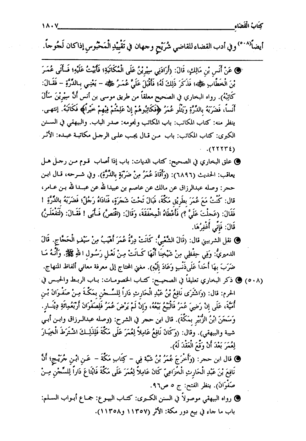 (¬508) • ذكر البخاري تعليقًا في الصحيح: كتاب الخصومات: باب الربط والحبس في الحرم: قال: (وَاشْتَرَى نَافِعُ بنُ عَبْدِ الْحَارِثِ دَارًا لِلسَّجْنِ بِمَكَّةَ مِنْ صَفْوَانَ بْنِ أُمَيَّةَ، عَلَى إِنْ رَضِيَ عُمَرُ فَالْبَيْعُ بَيْعُهُ، وَإِنْ لَمْ يَرْضَ عُمَرُ فَلِصَفْوَانَ أَرْبَعُمِائةِ ديْنَارٍ. وَسَجَنَ ابْنُ الزُّبَيْرِ بِمَكَّةَ). قال ابن حجر في الشرح: (وصله عبد الرزاق وابن أبي شيبة والبيهقي). وقال: (وَكَانَ نَافِعُ عَامِلًا لِعُمَرَ عَلَى مَكَّةَ. فَلِذَلِكَ اشْتَرَطَ الْخِيَارَ لِعُمَرَ بَعْدَ أَنْ وَقَّعَ الْعَقْدَ لَهُ).