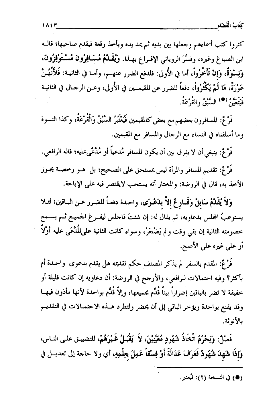 كثروا كتب أسماءهم وجعلها بين يديه ثم يمد يده ويأخذ رقعة فيقدم صاحبها؛ قاله ابن الصباغ وغيره، وفسَّرَ الروياني الإقراع بهذا. وَيُقَدَّمُ مُسَافِرُونَ مُسْتَوْفِزُونَ، وَنِسْوَةٌ، وَإِنْ تَأَخَّرُواْ، أما في الأُولى: فلدفع الضرر عنهم، وأما في الثانية: فَلأَنَّهُنَّ عَوْرَةٌ، مَا لَمْ يَكْثُرُواْ، دفعًا للضرر عن المقيمين في الأُولى، وعن الرجال في الثانية فَيَتَعَيَّنُ (•) السَّبْقُ والقُرْعَةُ.