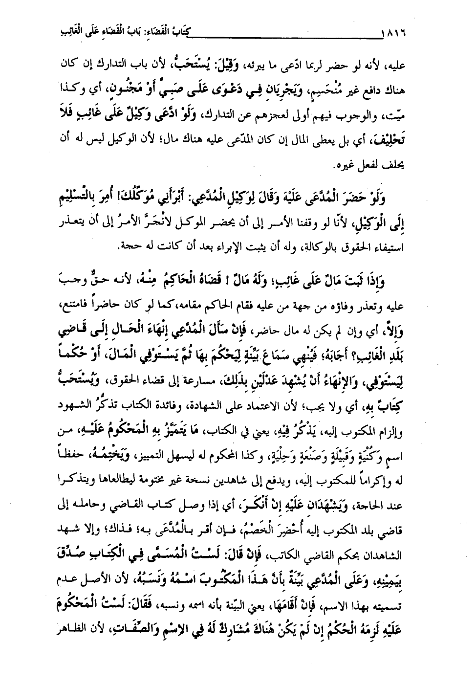 وَإذَا ثَبَتَ مَالٌ عَلَى غَائِبٍ؛ وَلَهُ مَالٌ! قَضَاهُ الْحَاكِمُ مِنْهُ، لأنه حقٌّ وجبَ عليه وتعذر وفاؤه من جهة من عليه فقام الحاكم مقامه، كما لو كان حاضرًا فامتنع، وَإِلاَّ، أي وإن لم يكن له مال حاضر، فَإِنْ سَأَلَ الْمُدَّعِي إِنْهَاءَ الْحَالِ إِلَى قَاضِي بَلَدِ الْغَائِبِ؟ أَجَابَهُ؛ فَيُنْهِي سَمَاعَ بَيِّنَةٍ لِيَحْكُمَ بِهَا ثُمَّ يَسْتَوْفِي الْمَالَ، أَوْ حُكْمًا لِيَسْتَوْفِي، وَالإِنْهَاءُ أَنْ يُشهِدَ عَدْلَيْنِ بِذَلِكَ، مسارعة إلى قضاء الحقوق، ويُسْتَحَبُّ كِتَابٌ بِهِ، أي ولا يجب؛ لأن الاعتماد على الشهادة، وفائدة الكتاب تذكُّرُ الشهود وإلزام المكتوب إليه، يَذْكُرُ فِيْهِ، يعني فِي الكتاب، مَا يَتَمَيَّزُ بِهِ الْمَحْكُومُ عَلَيْهِ، من اسمٍ وَكُنْيَةٍ وَقَبِيْلَةٍ وَصَنْعَةٍ وَحِلْيَةٍ، وكذا المحكوم له ليسهل التمييز، وَيَخْتِمُهُ، حفظًا له وإكرامًا للمكتوب إليه، ويدفع إلى شاهدين نسخة غير مختومة ليطالعاها ويتذكرا عند الحاجة، وَيَشْهَدَانِ عَلَيْهِ إِنْ أَنْكَرَ، أي إذا وصل كتاب القاضي وحامله إلى قاضي بلد المكتوب إليهَ أُحْضِرَ الْخَصْمُ، فإن أقر بالْمُدَّعَى به؛ فذاك؛ وإلا شهد الشاهدان بحكم القاضي الكاتب، فَإِنْ قَالَ: لَسْتُ الْمُسَمَّى فِي الْكِتَابِ صُدِّقَ بِيَمِيْنِهِ، وَعَلَى الْمُدَّعِي بَيِّنَةٌ بِأَنَّ هَذَا الْمَكْتُوبَ اسْمُهُ وَنَسَبُهُ، لأن الأصل عدم تسميته بهذا الاسم، فَإِنْ أَقَامَهَا، يعني البيّنة بأنه اسمه ونسبه، فَقَالَ: لَسْتُ الْمَحْكُومَ عَلَيْهِ لَزِمَهُ الْحُكْمُ إِنْ لَمْ يَكُنْ هُنَاكَ مُشَارِكٌ لَهُ فِي الاِسْمِ وَالصِّفَاتِ، لأن الظاهر