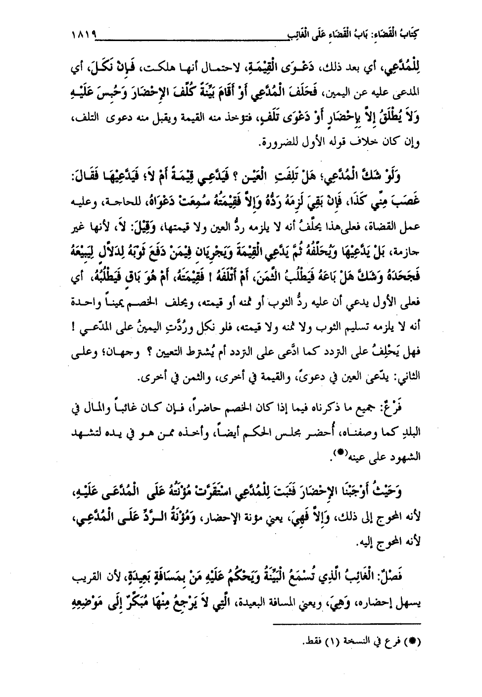 فَرْعٌ: جميع ما ذكرناه فيما إذا كان الخصم حاضرًا، فإن كان غائبًا والمال في البلدِ كما وصفناه، أُحضر مجلس الحكم أيضًا، وأخذه ممن هو في يده لتشهد الشهود على عينه (•).