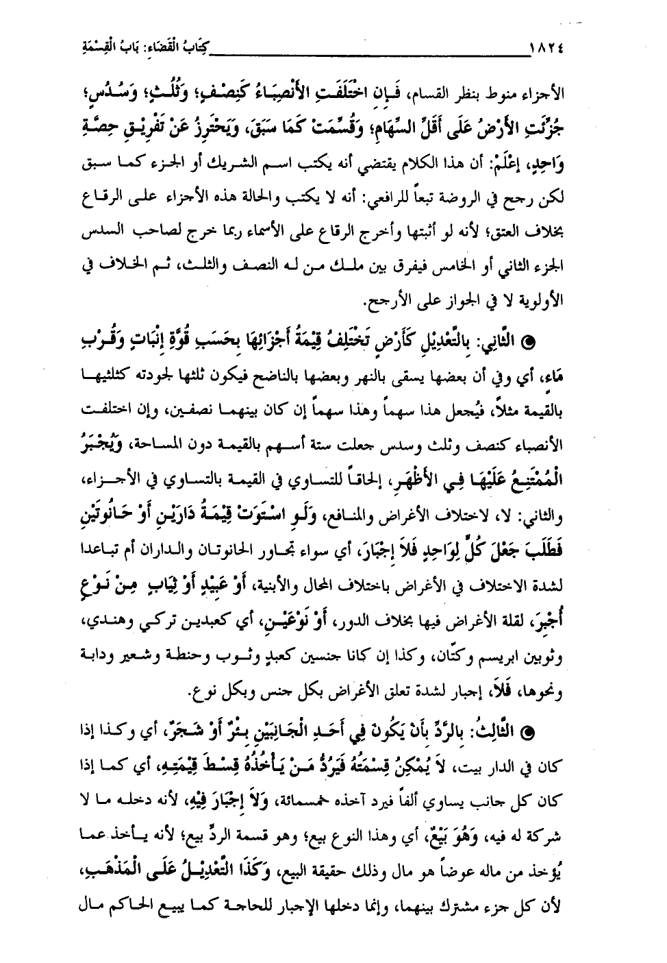 • الثَّانِي: بِالتَّعْدِيْلِ كَأَرْضٍ تَخْتَلِفُ قِيْمَةُ أَجْزَائِهَا بِحَسَبِ قُوَّةِ إِنْبَاتٍ وَقُرْبِ مَاءٍ، أي وفي أن بعضها يسقى بالنهر وبعضها بالناضح فيكون ثلثها لجودته كثلثيها بالقيمة مثلًا، فيُجعل هذا سهمًا وهذا سهمًا إن كان بينهما نصفين، وإن اختلفت الأنصباء كنصف وثلث وسدس جعلت ستة أسهم بالقيمة دون المساحة، وَيُجْبَرُ الْمُمْتَنِعُ عَلَيْهَا في الأَظْهَرِ، إلحاقًا للتساوي في القيمة بالتساوي في الأجزاء، والثاني: لا، لاختلاف الأغراض والمنافع، وَلَوِ اسْتَوَتْ قِيْمَةُ دَارَيْنِ أَوْ حَانُوتَيْنِ فَطَلَبَ جَعْلَ كُلِّ لِوَاحِدٍ فَلاَ إِجْبَارَ، أي سواء تجاور الحانوتان والداران أم تباعدا لشدة الاختلاف في الأغراض باختلاف المحال والأبنية، أَوْ عَبِيْدٍ أَوْ ثِيَابٍ مِنْ نَوْعٍ أُجْبِرَ، لقلة الأغراض فيها بخلاف الدور، أَوْ نَوْعَيْنِ، أي كعبدين تركي وهندي، وثوبين ابريسم وكتّان، وكذا إن كانا جنسين كعبدٍ وثوب وحنطة وشعير ودابة ونحوها, فَلَا، إجبار لشدة تعلق الأغراض بكل جنس وبكل نوع.