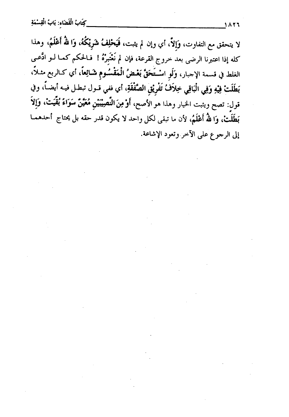 لا يتحقق مع التفاوت، وَإِلاَّ، أي وإن لم يثبت، فَيَحْلِفُ شَرِيْكُهُ، وَاللهُ أَعْلَمُ، وهذا كله إذا اعتبرنا الرضى بعد خروج القرعة، فإن لم نَعْتَبِرْهُ! فالحكم كما لو ادَّعى الغلط في قسمة الإجبار، وَلَوِ اسْتَحَقَّ بَعْضُ الْمَقْسُومِ شَائِعًا، أي كالربع مثلًا، بَطَلَتْ فِيْهِ وَفِي الْبَاقِي خِلاَفُ تَفْرِيقِ الصَّفْقَةِ، أي ففي قول تبطل فيه أيضًا، وفي قولٍ: تصح ويثبت الخيار وهذا هو الأصح، أَوْ مِنَ النَّصِيْبَيْنِ مُعَيَّنٌ سَوَاءٌ بُقَّيَتْ، وَإِلاَ بَطَلَتْ، وَاللهُ أَعْلَمُ, لأن ما تبقى لكل واحد لا يكون قدر حقه بل يحتاج أحدهما إلى الرجوع على الآخر وتعود الإشاعة.