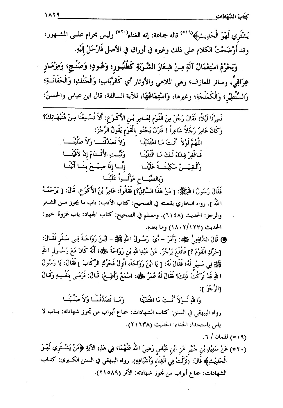 (¬520) عَنْ سَعِيْدِ بْنِ جُبَيْرٍ عَنِ ابْنِ عَبَّاسٍ رَضِيَ الله عَنْهُمَا؛ فِي هَذِهِ الآيَةِ {مَنْ يَشْتَرِي لَهْوَ الْحَدِيثِ} قَالَ: (نَزَلَتْ فِي الْغِنَاءِ وَأَشْبَاهِهِ). رواه البيهقي في السنن الكبرى: كتاب الشهادات: جماع أبواب من تجوز شهادته: الأثر (21589).