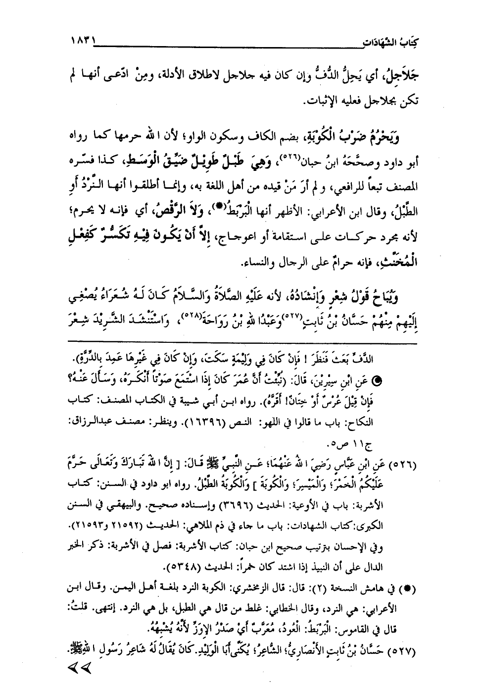 (•) في هامش النسخة (2): قال: قال الزمخشري: الكوبة النرد بلغة أهل اليمن. وقال ابن الأعرابي: هي النرد، وقال الخطابي: غلط من قال هي الطبل، بل هي النرد. إنتهى. قلتُ: قال في القاموس: الْبَرْبَطُ: الْعُودُ، مُعَرَّبٌ أَيْ صَدْرُ الإِوَزِّ لأَنَّهُ يُشْبِهُهُ.
