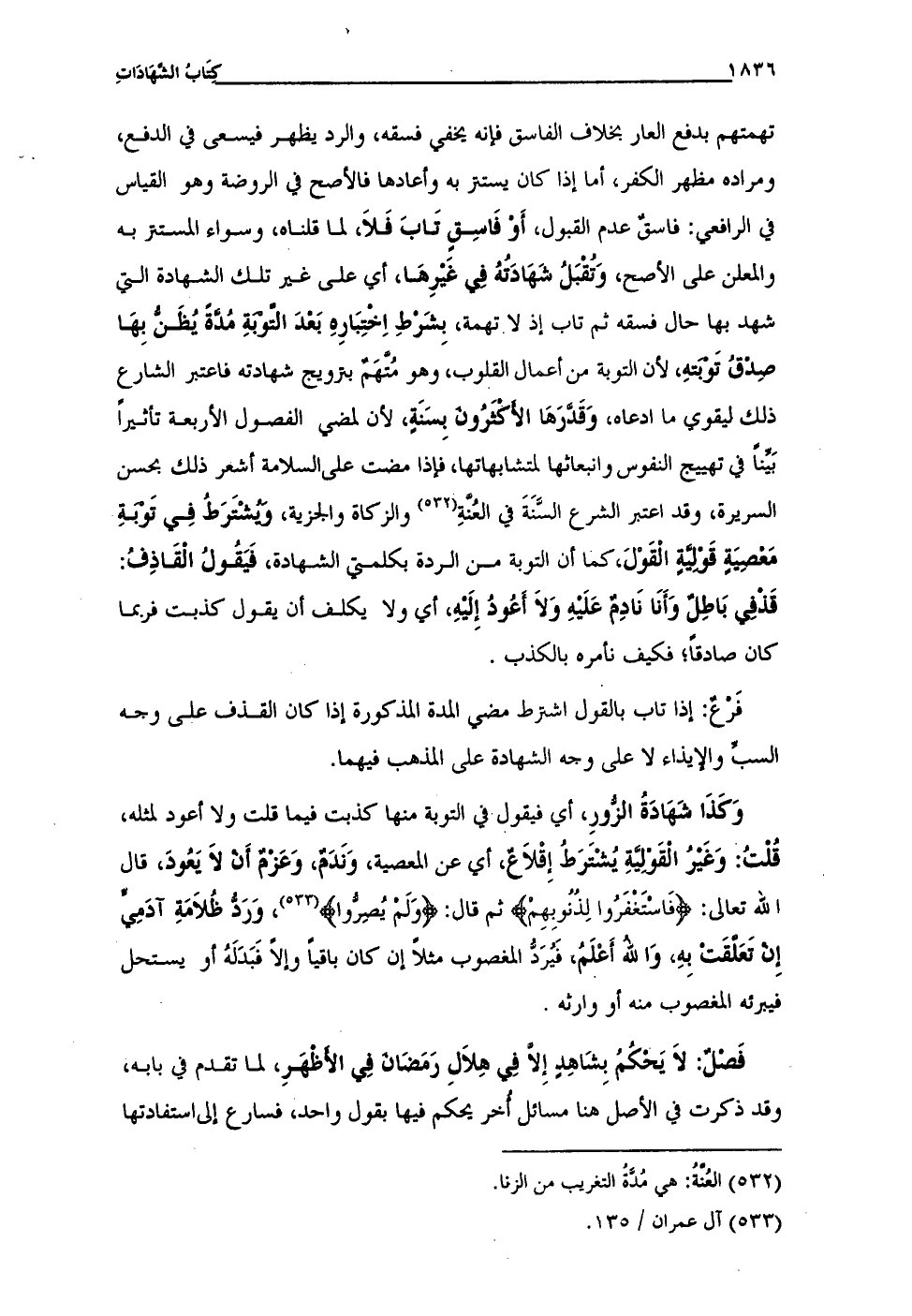 وَكَذَا شَهَادَةُ الزُّورِ، أي فيقول في التوبة منها كذبت فيما قلت ولا أعود لمثله، قُلْتُ: وَغَيْرُ الْقَوْلِيَّةِ يُشْتَرَطُ إِقْلاَعٌ، أى عن المعصية، وَنَدَمٌ، وَعَزْمٌ أَن لاَ يَعُودَ، قال الله تعالى: {فَاسْتَغْفَرُوا لِذُنُوبِهِمْ} ثم قال: {وَلَمْ يُصِرُّوا} (¬533)، وَرَدُّ ظُلاَمَةِ آدَمِيٍّ إِنْ تَعَلَّقَتْ بِهِ، وَاللهُ أَعْلَمُ، فَيُرَدُّ المغصوب مثلًا إن كان باقيًا وإلَّا فَبَدَلَهُ أو يستحل فيبرئه المغصوب منه أو وارثه.