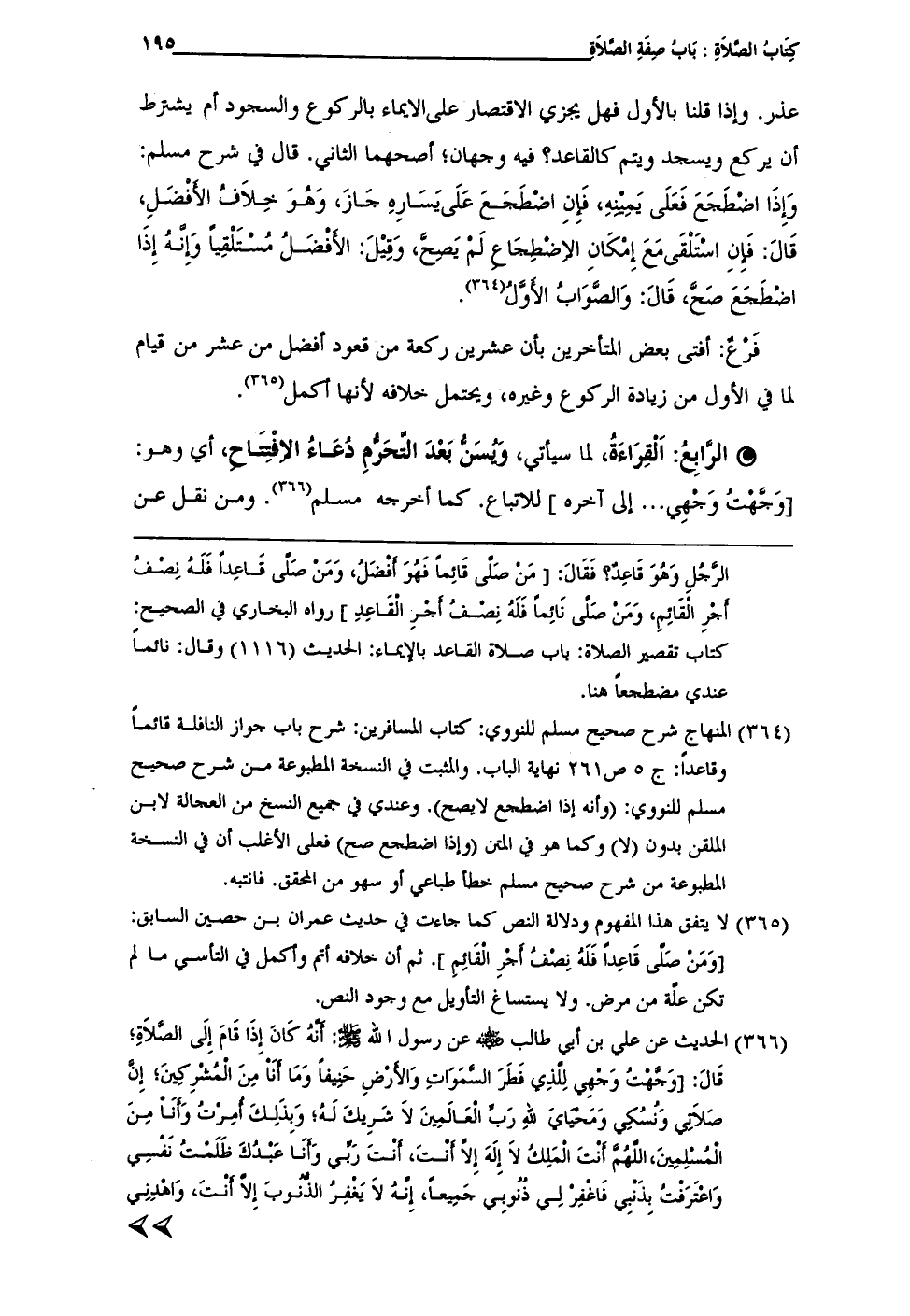 (¬364) المنهاج شرح صحيح مسلم للنووي: كتاب المسافرين: شرح باب جواز النافلة قائماً وقاعداً: ج 5 ص 261 نهاية الباب. والمثبت في النسخة المطبوعة من شرح صحيح مسلم للنووي: (وأنه إذا اضطجع لا يصح). وعندي في جميع النسخ من العجالة لابن الملقن بدون (لا) وكما هو في المتن (وإذا اضطجع صح) فعلى الأغلب أن في النسخة المطبوعة من شرح صحيح مسلم خطأ طباعي أو سهو من المحقق. فانتبه.