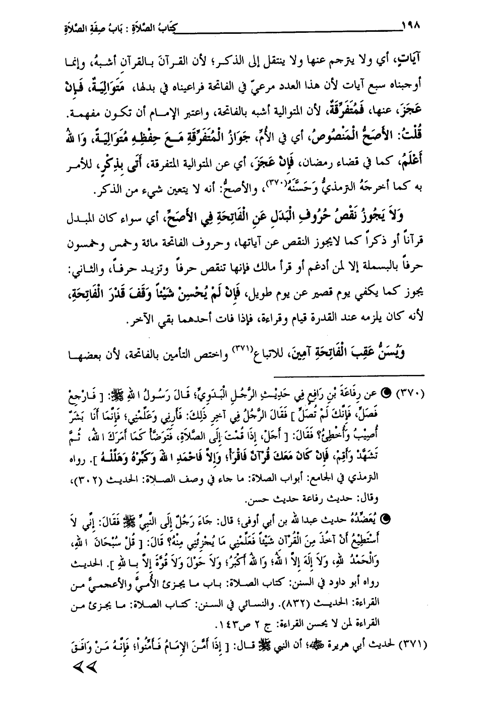 (¬370) عن رِفَاعَةَ بْنِ رَافِعٍ فِي حَدِيْثِ الرَّجُلِ الْبَدَوِيِّ؛ قَالَ رَسُولُ اللهِ - صلى الله عليه وسلم -: [فَارْجِعْ فَصَلِّ، فَإنِّكَ لَمْ تُصَلِّ] فَقَالَ الرَّجُلُ فِي آخِرِ ذَلِكَ: فَأَرِنِي وَعَلِّمْنِي؛ فَإِنَّمَا أَنَا بَشَرٌ أُصِيْبُ وَأُخْطِئُ؟ فَقَالَ: [أَجَلْ، إِذَا قُمْتَ إِلَى الصَّلاَةِ، فَتَوَضَّأُ كَمَا أَمَرَكَ الله، ثُمَّ تَشَهَّدْ وَأَقِمْ، فَإِنْ كَان مَعَكَ قُرْآنٌ فَاقْرَأْ؛ وَإِلَّا فَاحْمَدِ الله وَكَبَّرْهُ وَهَلِّلْهُ]. رواه الترمذي في الجامع: أبواب الصلاة: ما جاء في وصف الصلاة: الحديث (302)، وقال: حديث رفاعة حديث حسن.