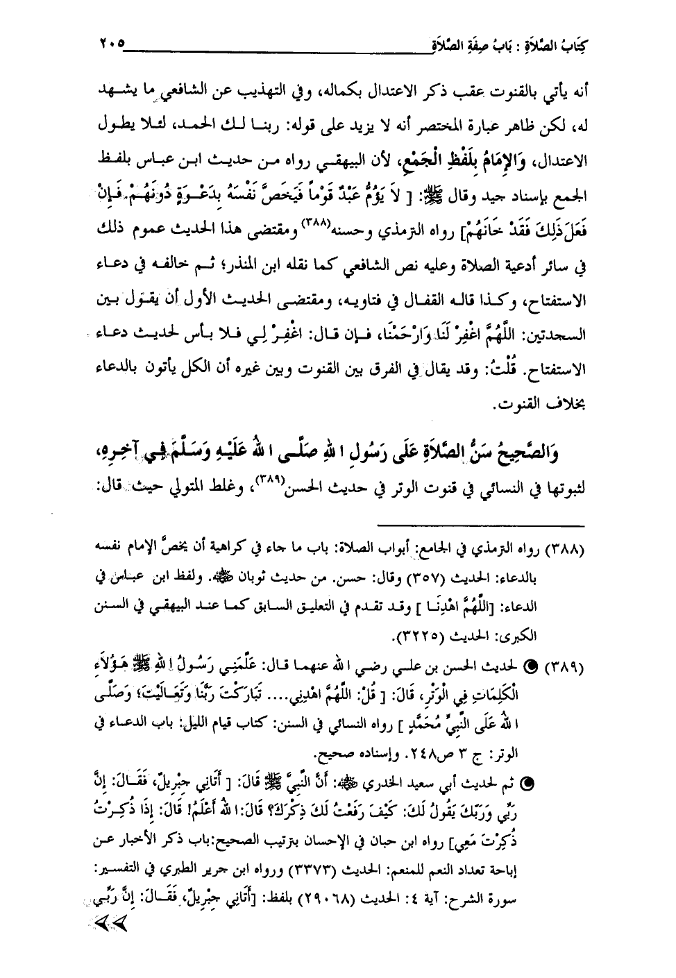 (¬389) • لحديث الحسن بن علي رضى الله عنهما قال: عَلَّمَنِي رَسُولُ اللهِ - صلى الله عليه وسلم - هَؤُلاَءِ الْكَلِمَاتِ فِي الْوِتْرِ، قَالَ: [قُلْ: اللَّهُمَّ اهْدِنِي. . . . تَبَارَكْتَ رَبَّنَا وَتَعَالَيْتَ؛ وَصَلَّى الله عَلَى النَّبِيِّ مُحَمَّدٍ] رواه النسائي في السنن: كتاب قيام الليل: باب الدعاء في الوتر: ج 3 ص 248. وإسناده صحيح.