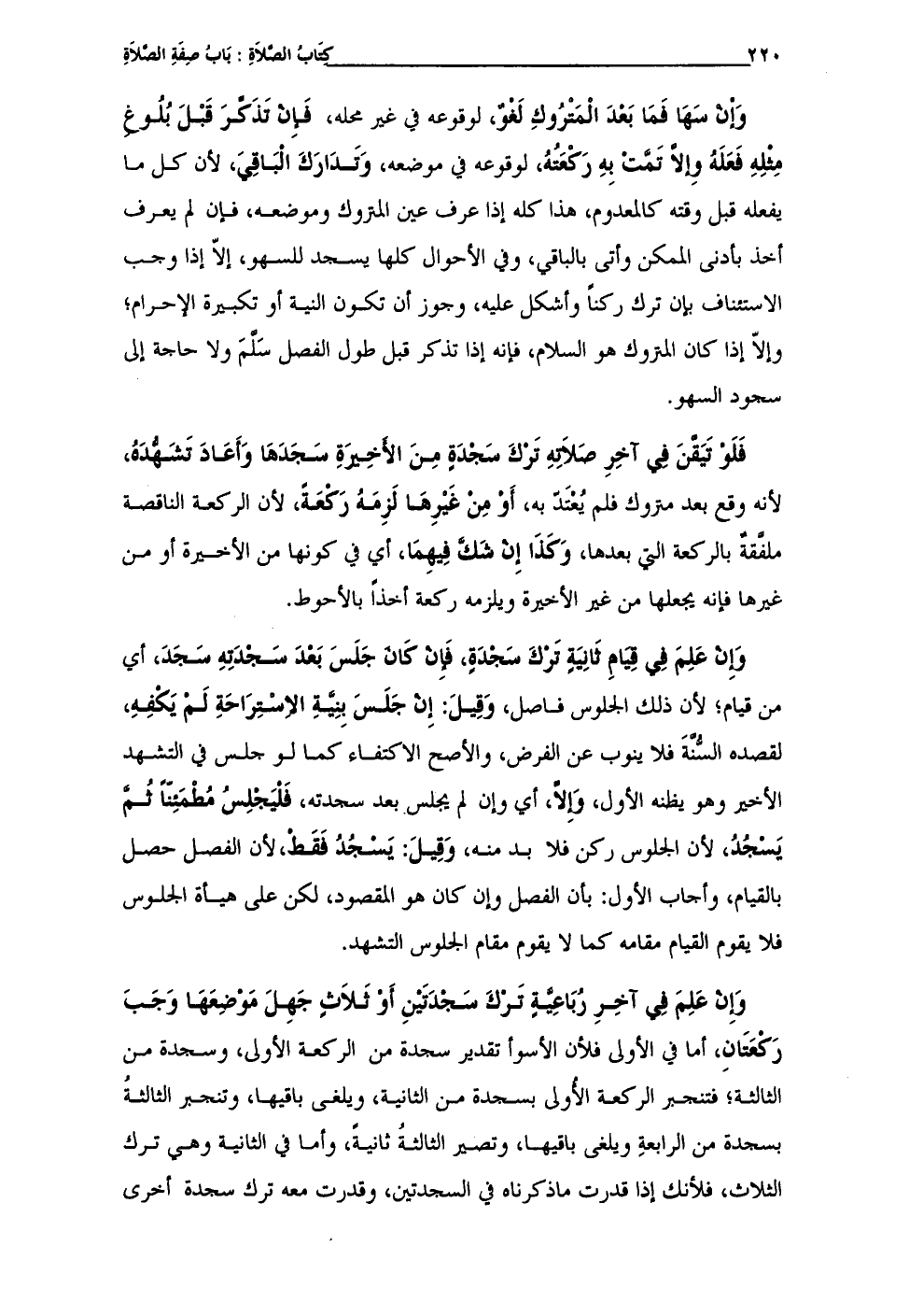 وَإْنْ سَهَا فَمَا بَعْدَ الْمَتْرُوكِ لَغْوٌ، لوقوعه في غير محله، فَإِنْ تَذَكِّرَ قَبْلَ بُلُوغِ مِثْلِهِ فَعَلَهُ وإلَّا تَمَّتْ بِهِ رَكْعَتُهُ، لوقوعه في موضعه، وَتَدَارَكَ الْبَاقِيَ؛ لأن كل ما يفعله قبل وقته كالمعدوم، هذا كله إذا عرف عين المتروك وموضعه، فإن لم يعرف أخذ بأدنى الممكن وأتى بالباقي، وفي الأحوال كلها يسجد للسهو، إلاّ إذا وجب الاستئناف بأن ترك ركنًا وأشكل عليه، وجوز أن تكون النية أو تكبيرة الإحرام, وإلاّ إذا كان المتروك هو السلام، فإنه إذا تذكر قبل طول الفصل سَلَّمَ ولا حاجة إلى سجود السهو.