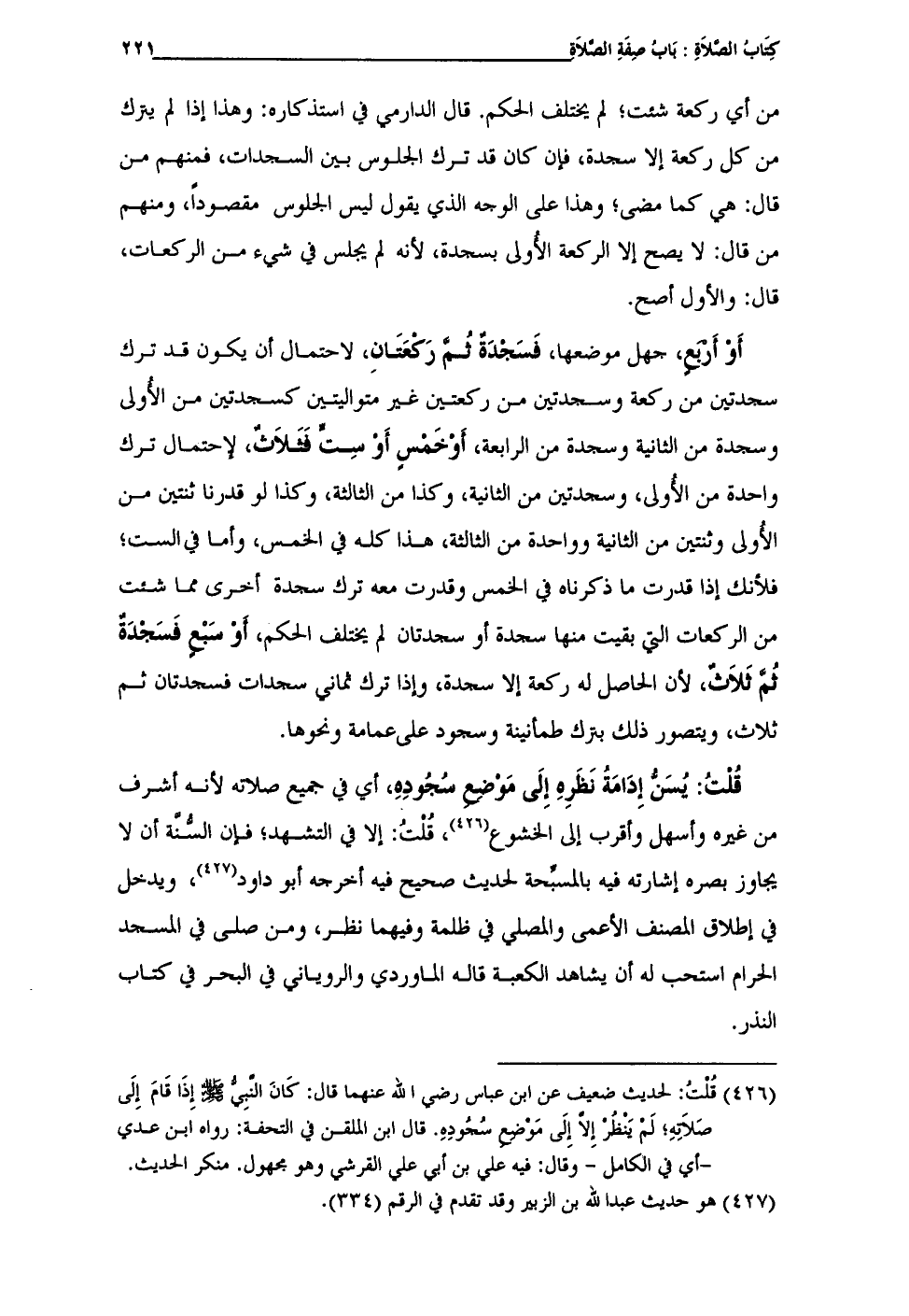 (¬426) قُلْتُ: لحديث ضعيف عن ابن عباس رضي الله عنهما قال: كَانَ النَّبِيُّ -صلى الله عليه وسلم - إِذَا قَامَ إِلَى صَلَاتِهِ؛ لَمْ يَنْظُرْ إِلَّا إِلَى مَوْضِعِ سُجُودِهِ. قال ابن الملقن في التحفة: رواه ابن عدي