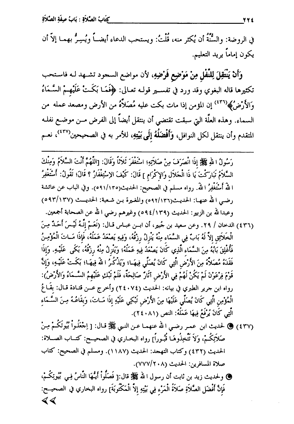 وَأَنْ يَنْتَقِلَ لِلنَّفْلِ مِنْ مَوْضِعِ فَرْضِهِ لأن مواضع السجود تشهد له فاستحب تكثيرها قاله البغوي وقد ورد في تفسير قوله تعالى: {فَمَا بَكَتْ عَلَيْهِمُ السَّمَاءُ وَالْأَرْضُ} (¬436) إن المؤمن إذا مات بكت عليه مُصَلَّاهُ من الأرض ومصعد عمله من السماء. وهذه العلَّة التى سبقت تقتضى أن ينتقل أَيضًا إلى الفرض من موضع نفله المتقدم وأن ينتقل لكل النوافل، وَأَفْضَلُهُ إِلَى بَيْتِهِ، للأمر به في الصحيحين (¬437)، نعم