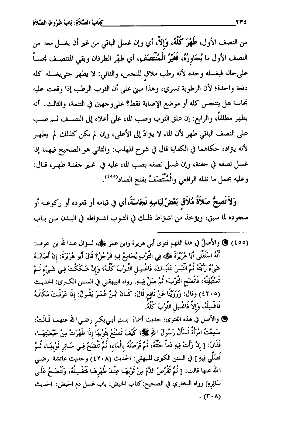 (¬455) • والأصلُ في هذا الفهم فتوى أبي هريرة وابن عمر - رضي الله عنهم -، لسؤال عبد الله بن عوف: أَنَّهُ اسْتَفْتَى أَبَا هُرَيْرَةَ - رضي الله عنه - فِي الثَّوْبِ يُجَامِعُ فِيهِ الرَّجُلُ؟ قَالَ أَبُو هُرَيْرَةَ: إِنْ أَصَابَهُ شَيْءٌ رَأَيْتَهُ ثُمَّ الْتَبَسَ عَلَيْكَ، فَاغْسِلِ الثَّوْبَ كُلَّهُ؛ وَإِنْ شَكَكْتَ فِي شَيْءٍ لَمْ تَسْتيْقِنْهُ، فَانْضَحِ الثَّوْبَ؛ ثُمَّ صَلِّ فِيهِ. رواه البيهقي في السنن الكبرى: الحديث (4205) وقال: وَرَيْنَا عَن نَافِعٍ قَالَ: كَانَ ابْنُ عُمَرَ يَقُولُ: إِذَا عَرَفْتَ مَكَانَهُ فَاغْسِلْهُ، وَإِلَّا فَاغْسِلِ الثَّوْبَ كُلَّهُ.
