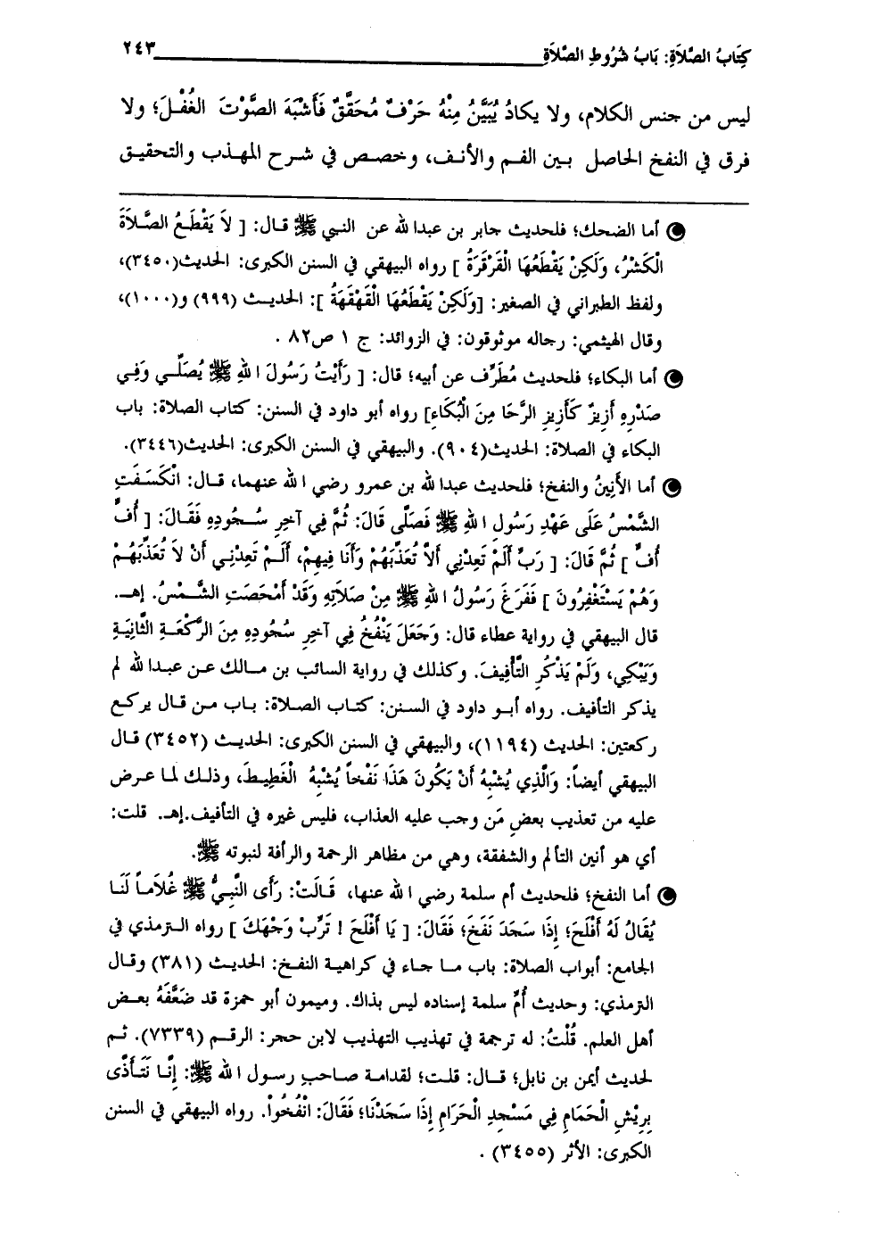 • أما الأَنِينُ والنفخ؛ فلحديث عبد الله بن عمرو رضي الله عنهما، قال: انْكَسَفَتِ الشَّمْسُ عَلَى عَهْدِ رَسُولِ الله فَصَلَّى قَالَ: ثُمَّ فِي آخِرِ سُجُودِهِ فَقَالَ: [أُفٍّ أفٍّ] ثُمَّ قَالَ: [رَبَّ أَلَمْ تَعِدْنِي ألا تُعَذبَهُمْ وَأَنَا فِيهِمْ، أَلَمْ تَعِدْنِي أَنْ لاَ تُعَذِّبَهُمْ وَهُمْ يَسْتَغْفِرُونَ] فَفَرَغَ رَسُولُ الله - صلى الله عليه وسلم - مِنْ صَلاَتِهِ وَقَدْ أَمْحَصَتِ الشُّمْسُ. إهـ.