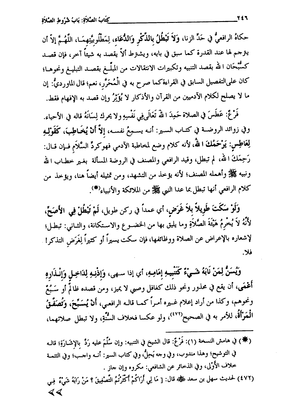 حكاهُ الرافعيُّ في حَدِّ الزنا، وَلاَ تَبْطُلُ بِالذِّكْرِ وَالدُّعَاءِ، لِمَطْلُوبِيَّتِهِمَا، الَّلُهُمَّ إلاّ أن يترجم لها عند القدرة كما سبق في بابه، ويشترط ألاّ يقصد به شيئاً أخر، فإن قصد كسُّبْحَان الله بقصد التنبيه وتكبرات الانتقالات من المبلَّغ بقصد التبليغ ونحوها؛