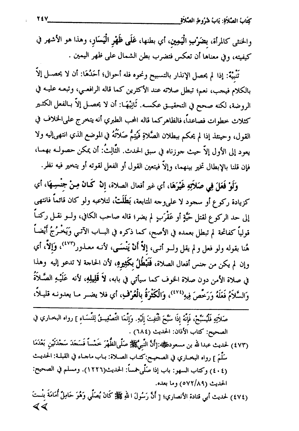 (¬473) لحديث عبدالله بن مسعود -رضي الله عنه-: [أَنَّ النَّبِيَّ -صلى الله عليه وسلم- صَلَّى الظُّهْرَ خَمْسًا فَسَجَدَ سَجْدَتَيْنِ بَعْدَمَا سلَّمَ] رواه البخاري في الصحيح: كتاب الصلاة: باب ما جاء في القبلة: الحديث (404) وكناب السهو: باب إذا صَلَّى خمساً: الحديث (1226). ومسلم في الصحيح: الحديث (89/ 572) وما بعده.