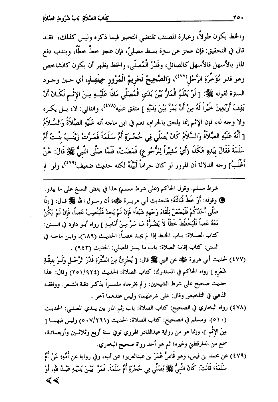 (¬477) لحديث أبي هريرة -رضي الله عنه- عن النبي -صلى الله عليه وسلم- قال: [يُجْزِئُ مِنَ السُّتْرَةِ قَدْرَ الرَّحْلِ وَلَوْ بِدِقَّةِ شَعْرِهِ] رواه الحاكم في المستدرك: كتاب الصلاة: الحديث (924/ 251) وقال: هذا حديث صحيح على شرط الشيخين، ولم يخرجاه مفسراً بذكر دقة الشعر. ووافقه الذهبي في التلخيص وقال: على شرطهما؛ وليس عندهما أخر.