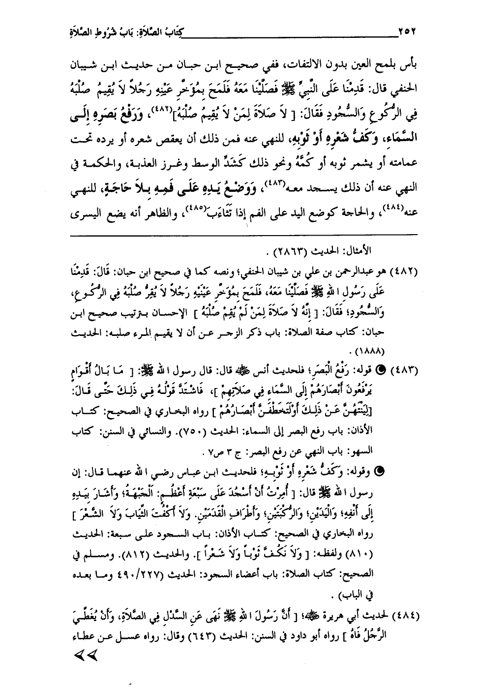 بأس بلمح العين بدون الالتفات، ففى صحيح ابن حبان من حديث ابن شيبان الحنفي قال: قَدِمْنَا عَلَى النَّبِيِّ - صلى الله عليه وسلم - فَصَلَّيْنَا مَعَهُ فَلَمَحَ بِمُؤَخَّرِ عَيْنِهِ رَجُلًا لاَ يُقِيمُ صُلْبَهُ فِي الرُّكُوعِ وَالسُّجُودِ فَقَالَ: [لاَ صَلاَةَ لِمَنْ لاَ يُقِيمُ صُلْبَهُ] (¬482)، وَرَفْعُ بَصَرِهِ إِلَى السَّمَاءِ، وَكَفُّ شَعْرِهِ أَوْ ثَوْبِهِ، للنهي عنه فمن ذلك أن يعقص شعره أو يرده تحت عمامته أو يشمر ثوبه أو كُمَّهُ ونحو ذلك كَشَدِّ الوسط وغرز العذبة، والحكمة في النهي عنه أن ذلك يسجد معه (¬483)، وَوَضْعُ يَدِهِ عَلَى فَمِهِ بِلاَ حَاجَةٍ، للنهي عنه (¬484)،